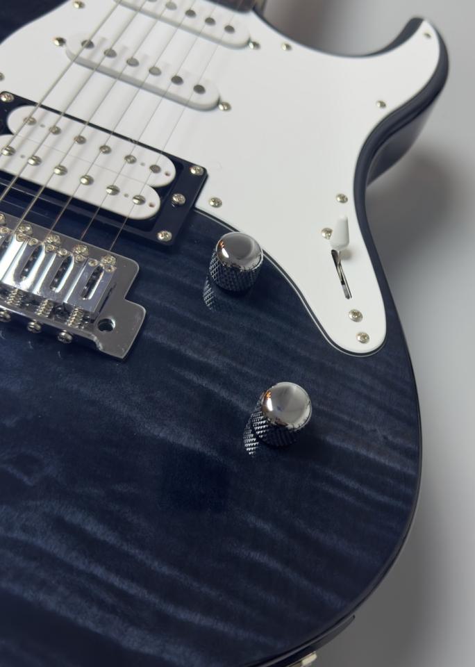 PACIFICA112Vをベースに、ボディトップとヘッドストックに美しいフレイムメイプルを配した個性的で高級感あふれるモデル。リアのハムバッキングピックアップにコイルタップ機能を搭載し、ハムバッキング→シングル、シングル→ハムバッキングの切り替えが瞬時に可能。見た目の美しさだけでなく、PACIFICAシリーズのもつ多様性も持たせたモデル。