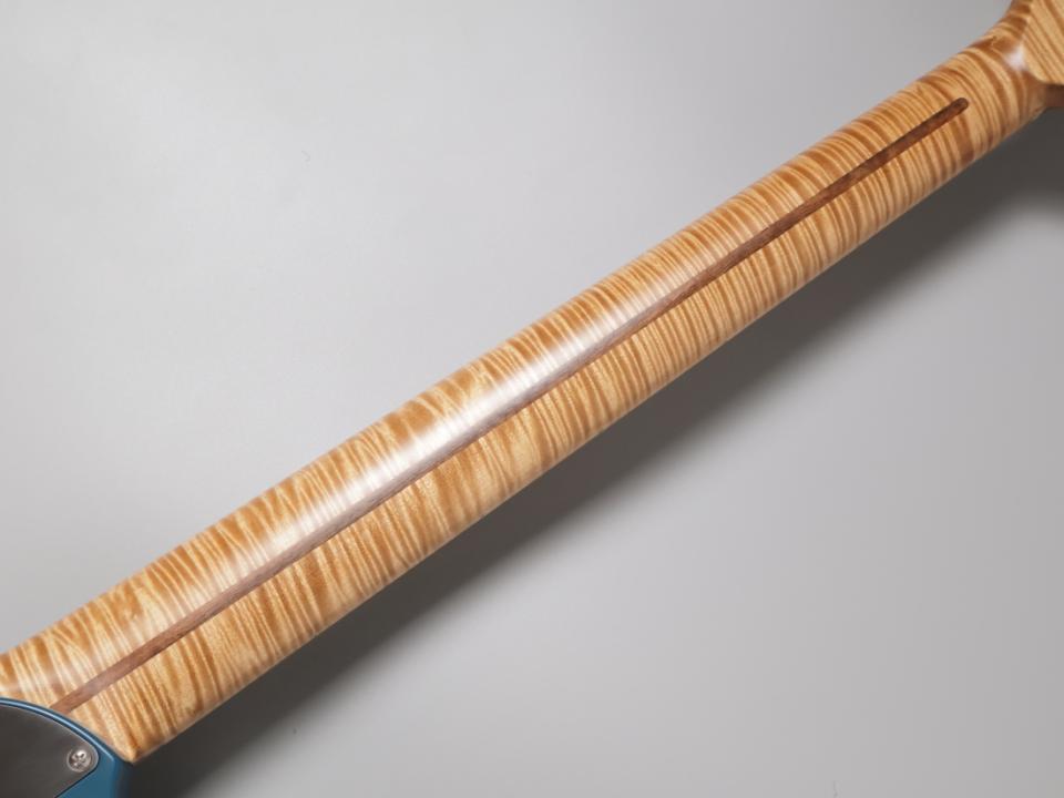 ソリッドアルダーボディに超豪華な1Pフレイムメイプルネック/フレイムメイプル指板でインチスケールは34となります。