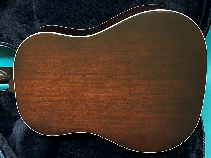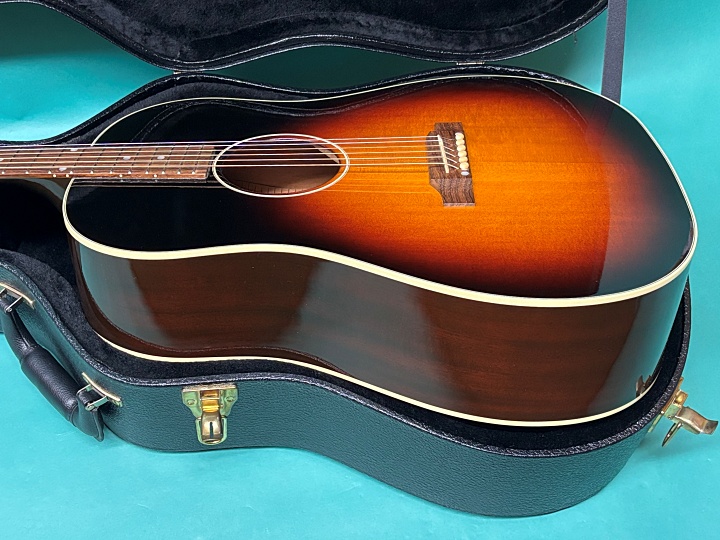 ボディトップはスプルース、サイド&バックはマホガニー、ネックもマホガニー、指板・ブリッジはローズウッドです。ナット幅は43.8mm、スケールは約628mm、ネックグリップは薄めのスリムテーパーが採用されています。ナット・サドルにはTUSQ素材が使用され、ペグはグローバー製のオープンバック・ニッケルを搭載。メッキにくすみは見られるものの、動作はスムーズです。シンプルなドットポジションマークに、ヘッドロゴはスクリプト・ギブソンロゴ、"Limited"と刻まれたトラスロッドカバー、ヘッド裏にはGibson Custom Shopの刻印が施されています。艶のあるグロスフィニッシュに、カラーはサンセットバーストが採用されており、通常のヴィンテージサンバーストよりやや赤みのある仕上がりです。