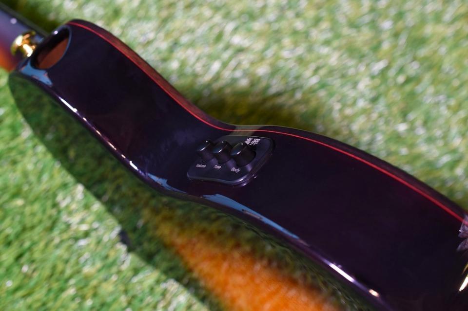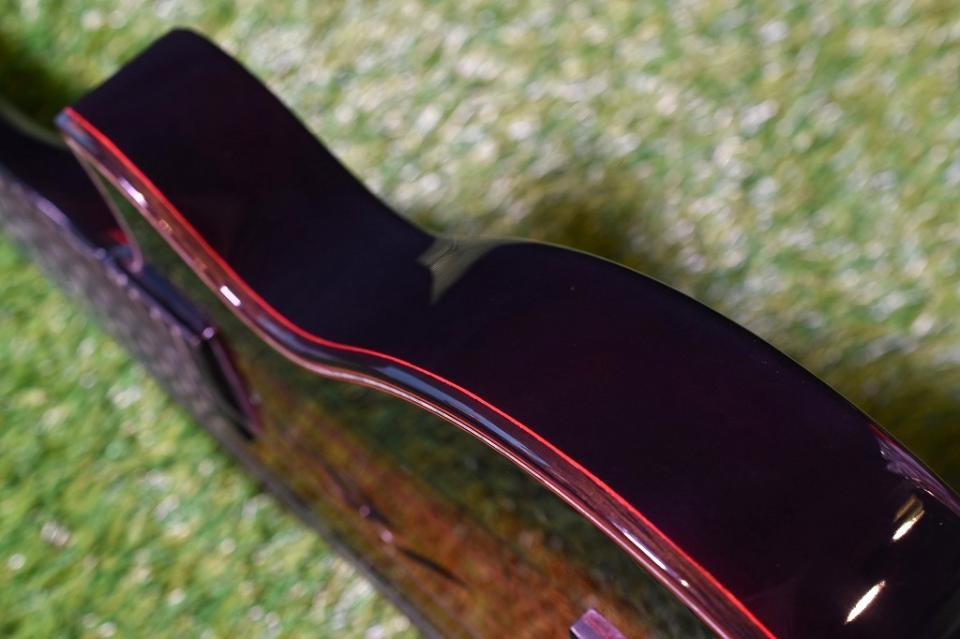 薄目のボディながらトップがハワイアンコア単板、サイドバックはメイプル1ピース構造で、