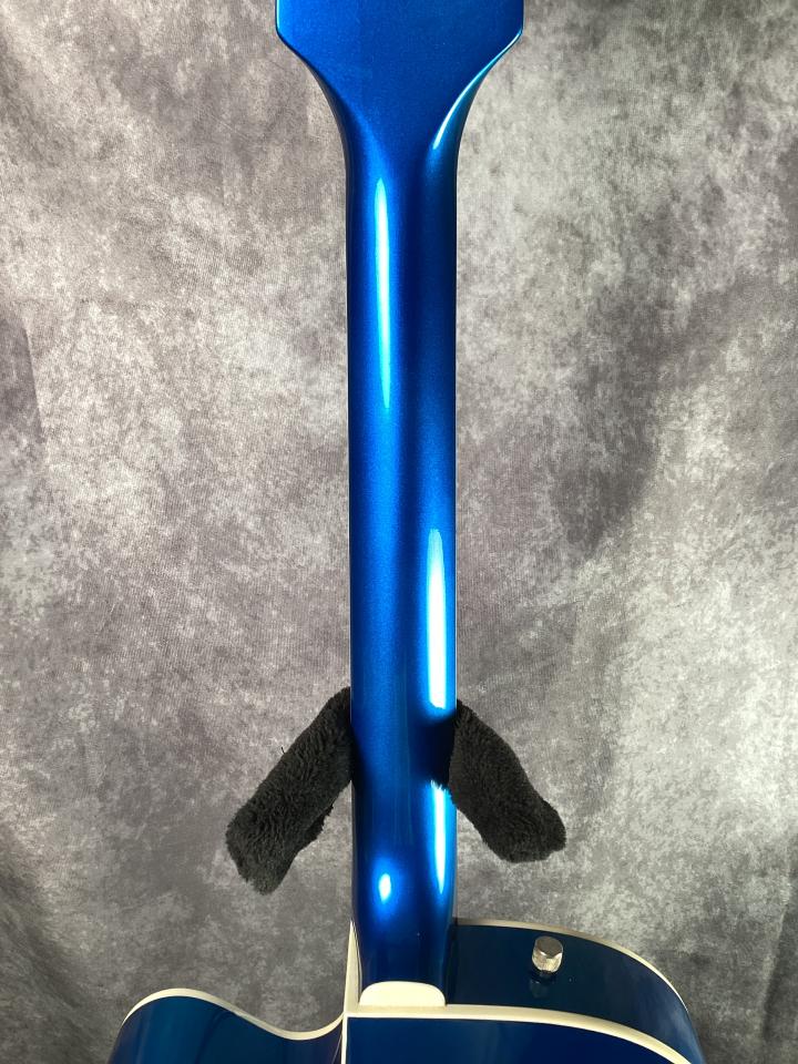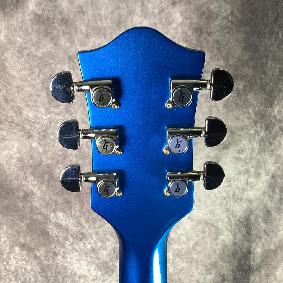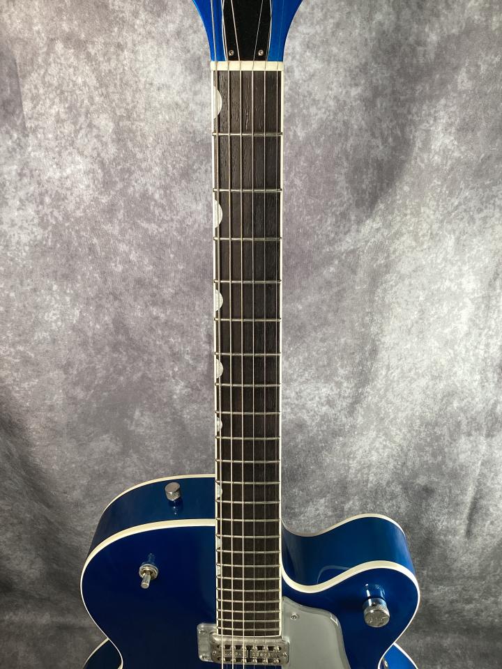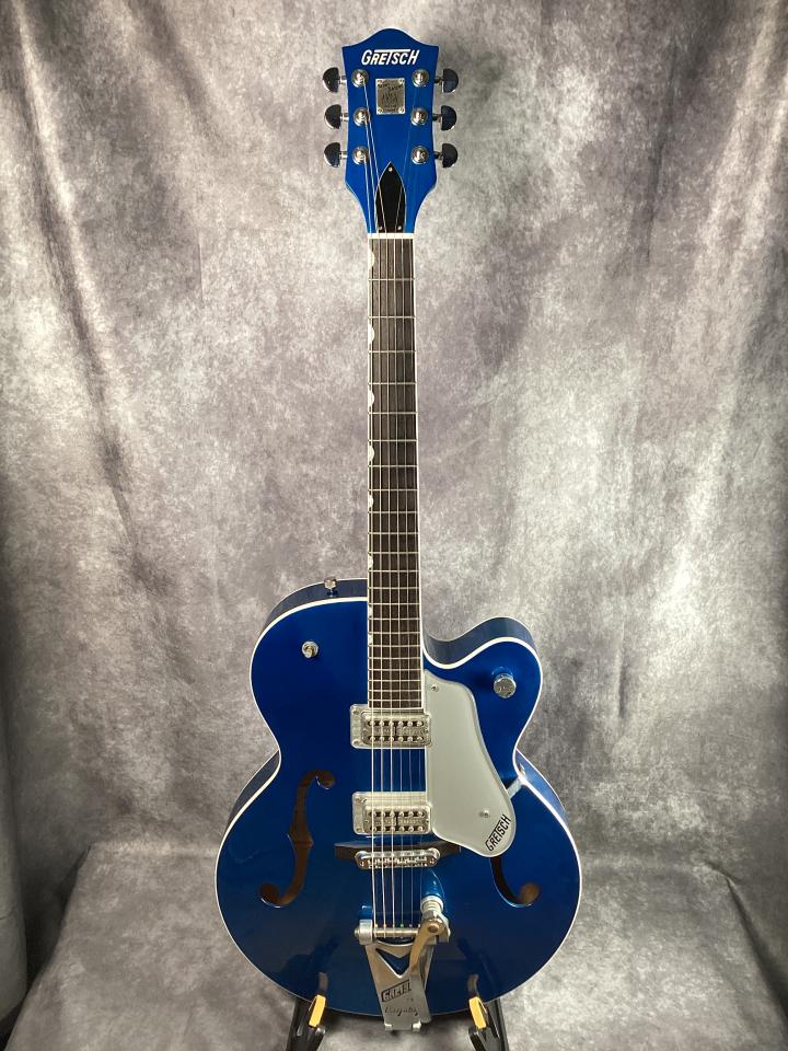 6120のクラシカルなグレッチ・シェイプをベースにしながら、メタリックブルーのアメ車を彷彿とさせる印象的なカラーリングが目を引く一本です。