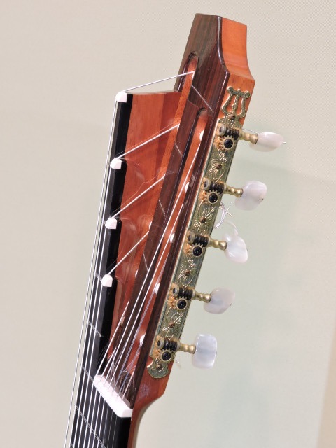 下降スケールに調弦された7~11コースの低音弦が演奏曲すべての和音の綾に共鳴し、リュートさながらに織りなす響きは、ルネサンス楽曲にも打ってつけです。