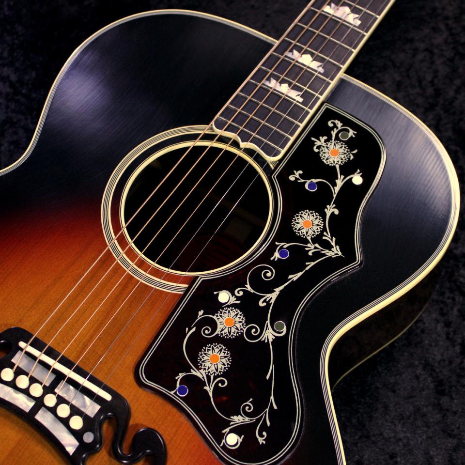 ニカワ接着によりブレーシングが施されたサーマリー・エイジド・アディロンダック・レッドスプルース・トップ、サイド板とバック板にはローズウッド、そして指板とブリッジにはエボニーが採用されています。細部の仕様の再現にも余念がありません。バインディングの施された指板、ヴィンテージ・スタイルのスクリプト・ギブソン・ロゴ、そしてユニークで唯一無二のデザインをもつピックガードといった仕様の数々が、カスタムモデルとしての風合いを本器全体に渡ってもたらしています。