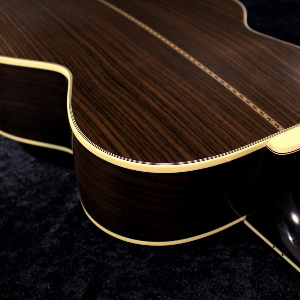 本モデルトップにはサーマリー・エイジド・アディロンダック・レッドスプルース、サイド&バックには重厚なローズウッド、指板とブリッジにはエボニーを採用。