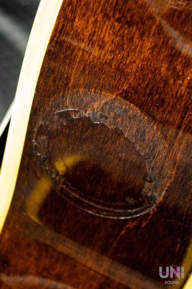 細めのネック、ディッシュ・インレイ。L-50はスプルース単板トップにメイプル単板サイド/バック!マホガニーネック、ハカランダ指板を基本スペックにしていることが多く、枯れたサウンドですが、高域も低域も意外と鳴ります。