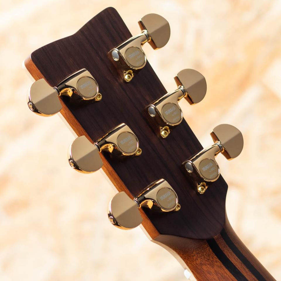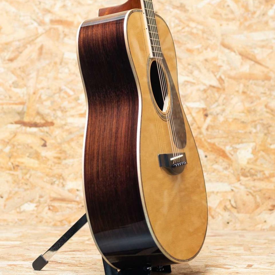 国内外問わず使用アーティストも多い、日本を代表するブランド”YAMAHA”。ダイナミックギターから始まりFG、更には豪華なを意味するL(Luxury)シリーズが最高機種として1974年に発売されました。Lシリーズ誕生40周年という節目で2004年にフルモデルチェンジし現在まで製造が続けられています。本器は国産26/36とも一線を画す、受注生産モデル”LS56 Custom ARE”。高い評価を得るARE処理を施した美しいイングルマンスプルーストップ材、インディアンローズウッドサイド&バック、マホガニー&ローズウッド5プライネック、エボニー指板&ブリッジ、スノウフレイクス&キャッツアイ指板インレイ、アバロンヘッド&ボディトリム、アバロンロゼッタ、メイプルバインディング、べっ甲柄ピックガードTM67Gゴールドペグ。サウンドメイクの肝であるトップブレイシングにはノンスキャロップ・ブレイシング構造が採用されています。小さいながらに芯のある伸びやかなサウンド。時に力強く、時に哀愁感のある、ヤマハフォークサウンドをしっかりと引き継いでいます。小ぶりなモデルですが、胴厚があるので、そこまで低音感が寂しくなく、取り回し良く幅広くお使いいただける名デザインモデルです。徹底した美しい仕上がりは、”カスタム”の称号を冠するモデルならでは。ぜひご検討ください。