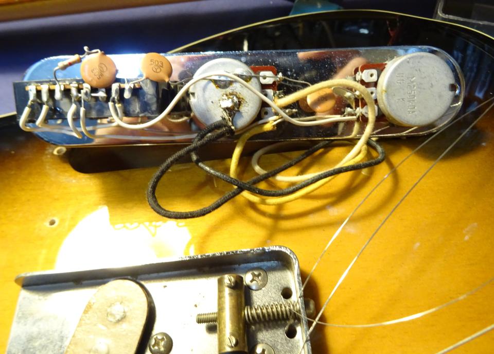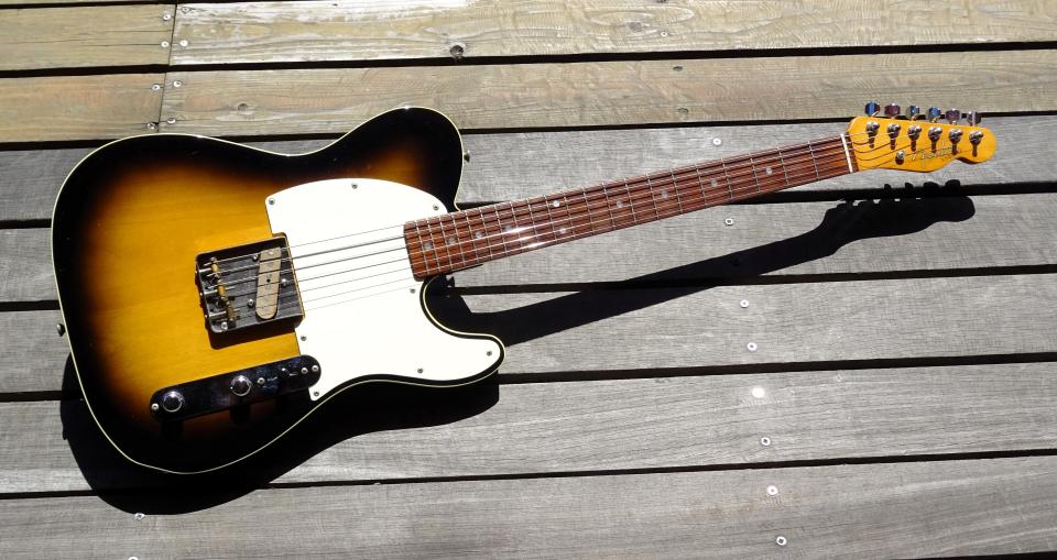 2トーンサンバーストにローズネック仕様。ブラスブリッジがマウントされています。