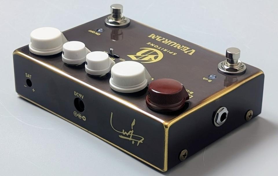 特筆すべきは、サイドに設けられた「SAT(サチュレーション)」トリマーです。真空管アンプのパワー管が歪み始める際の絶妙な飽和感を微調整でき、使用するアンプや会場の響きに合わせて「最高の鳴り」を追い込むことができます。 重量は約815gと、ペダルとしてはかなりの重厚感。しかし、この重さこそがVEMURAMの代名詞であるブラス(真鍮)筐体と、厳選されたN.O.S.パーツを惜しみなく投入した証です。手に取った瞬間に伝わる「所有する喜び」と、踏み込んだ瞬間に広がる「本物のトーン」を、ぜひ体感してください。
