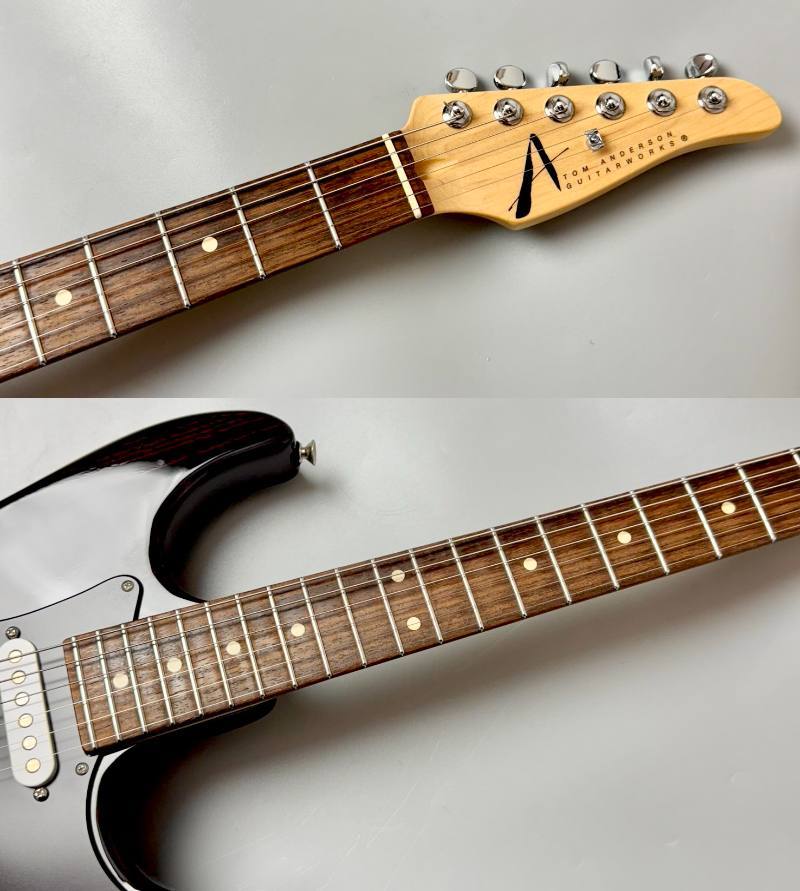 フレットにはステンレスフレットを採用し、クリアで豊かな倍音成分を持ちつつ、ステンレス特有の鋭さを抑えたバランスの良いサウンドを実現。高い耐久性に加え、Tom Andersonのサウンドコンセプトに沿った滑らかな音の伸びが得られます。フレットサイズはミディアムジャンボを採用しており、テクニカルなプレイでもストレスの少ない快適なフィンガリングが可能。