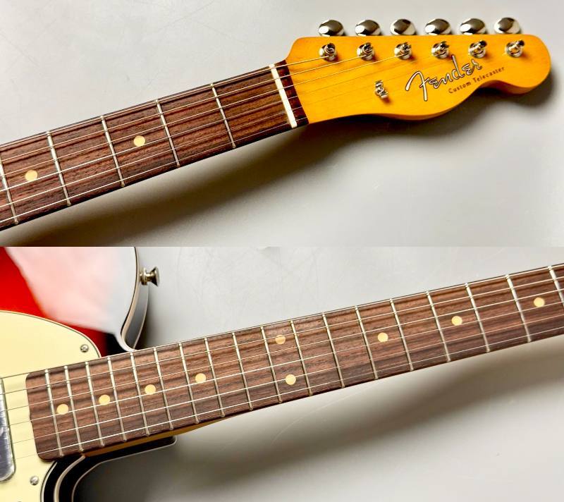 Custom Aesthetics: 3カラー・サンバーストのアルダーボディに、トップとバックの両面に施されたホワイト・バインディング。テレキャスター・カスタムならではの、引き締まった精悍なルックスと高級感を完璧に再現しています。