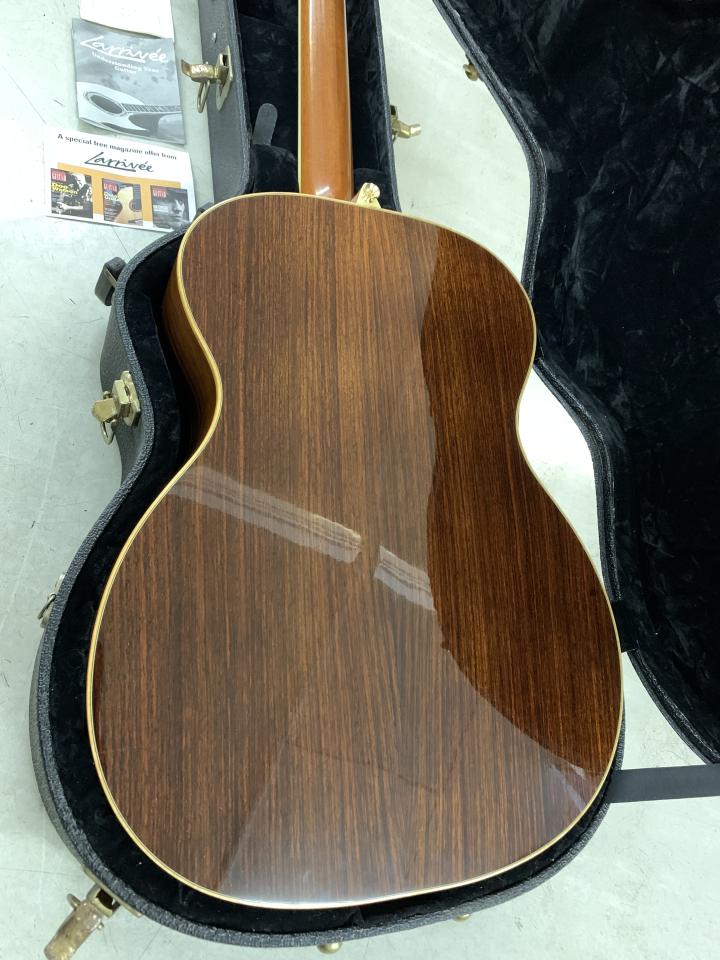 グロス・フィニッシュのOM(オーケストラ・モデル)ボディに、サウンド・ホールのロゼットに美しいアバロン貝を使用した高級感のある仕様です。ボディ材はすべてソリッド(単板)で、トップはカナディアン・シトカ・スプルース、サイド&バックはローズウッドを使用しています。ネックはワンピース・マホガニーを贅沢に使用しています。ラリヴィーの特長でもあるダヴテイル・ネックジョイントやシンメトリカル・パラボリックXブレーシングを採用しています。