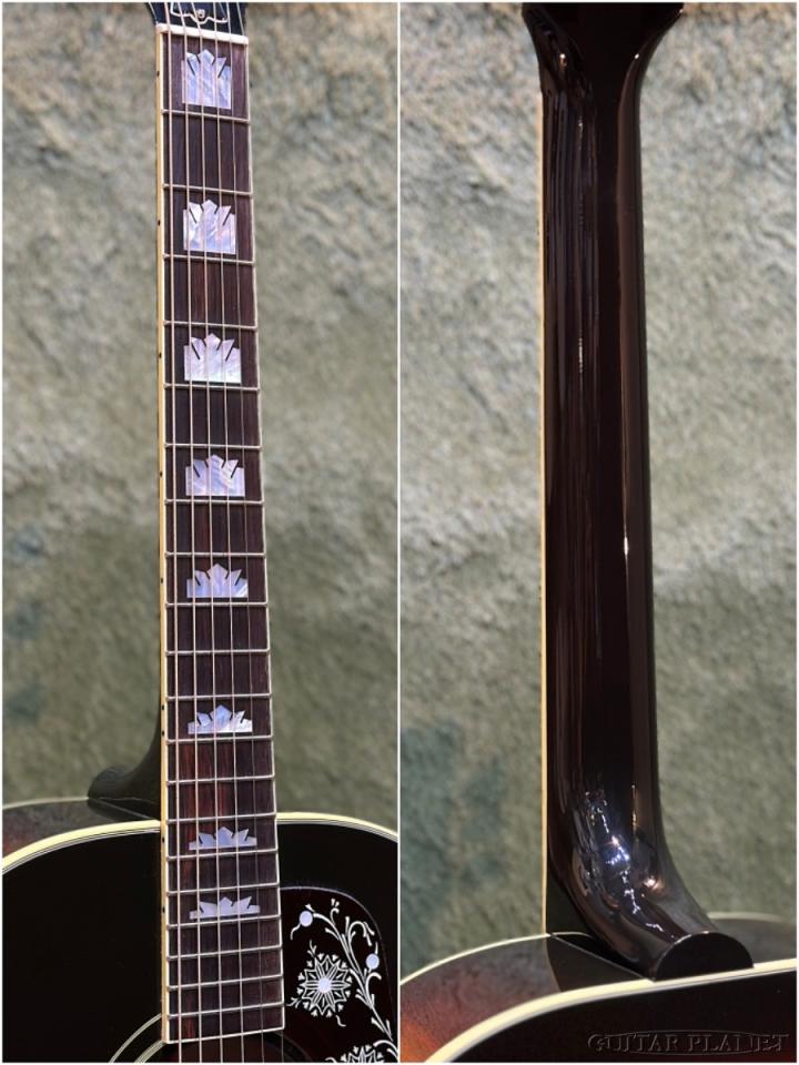 J-200のボディ幅を、約1インチほどコンパクトにしたトップには『AAグレード・シトカ・スプルース』、主にアラスカ産を使用し、サイド&バックには主にアメリカ北東エリア産の『AAグレード・メイプル』。ネック材は純種の『ジェニュイン・マホガニー』中南米エリアの主にグアテマラン産を使用しています。指板&ブリッジには『インディアン・ローズウッド』を使用し、発売当初のマテリアルを限りなく継承しています。