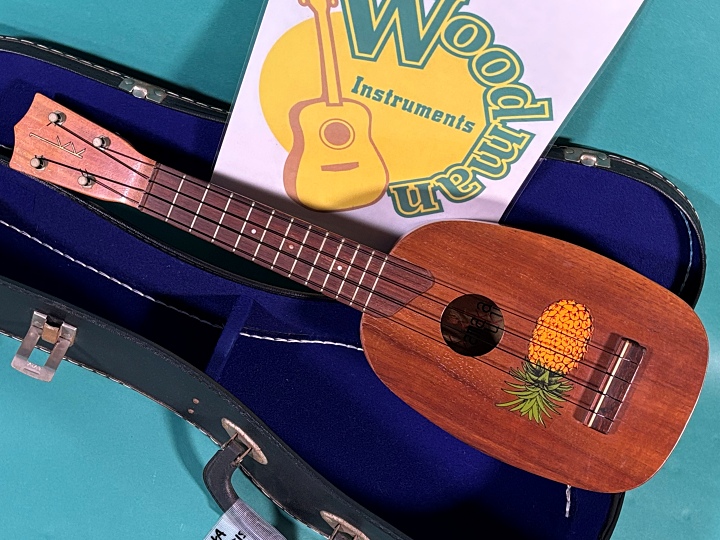 パイナップルのデカールはKamaka初期のモノの復刻モデルとして発売当初から貼られていた可能性もありますが、歴代のオーナーにより後から貼られた可能性もあります。いずれにしろ自然な雰囲気です。スリキズや浅いピックキズはありますが、大きなダメージは見られません。