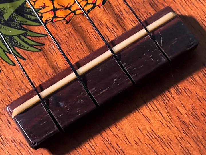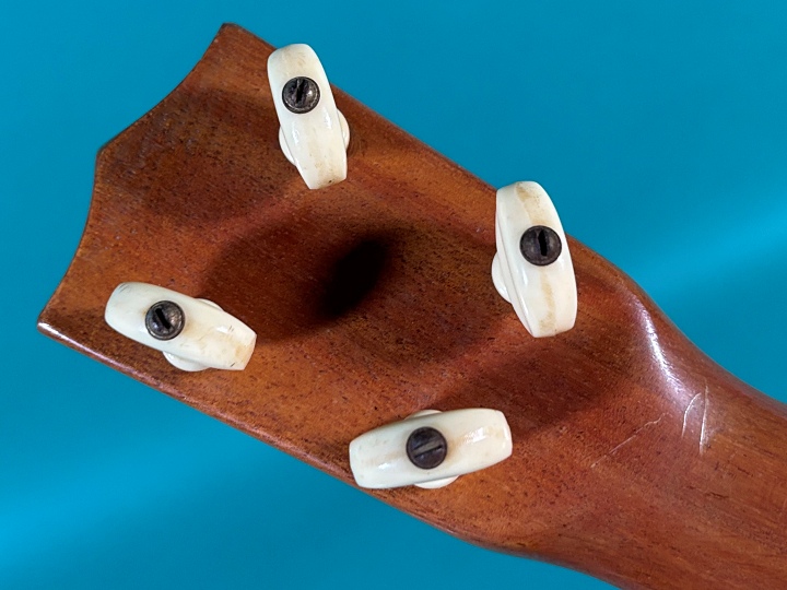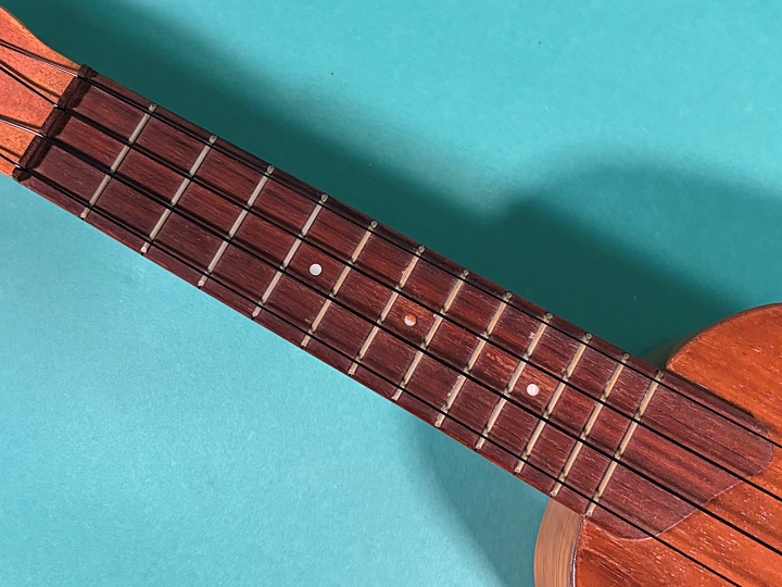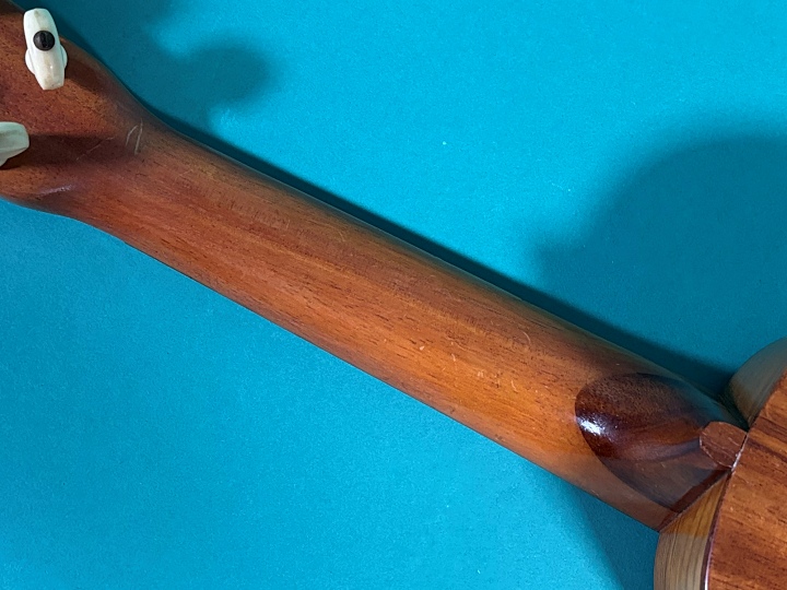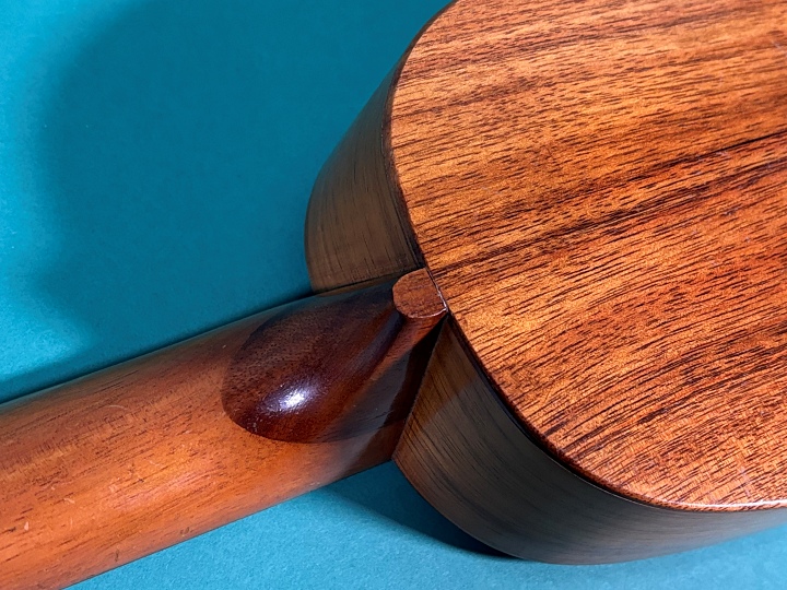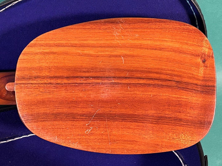 ボディはコア、ネックはコア、指板はローズウッド、ブリッジはローズウッドです。指板のジョイント部は斜めにカットされており、同年代のハワイ製カマカに近い仕様です。