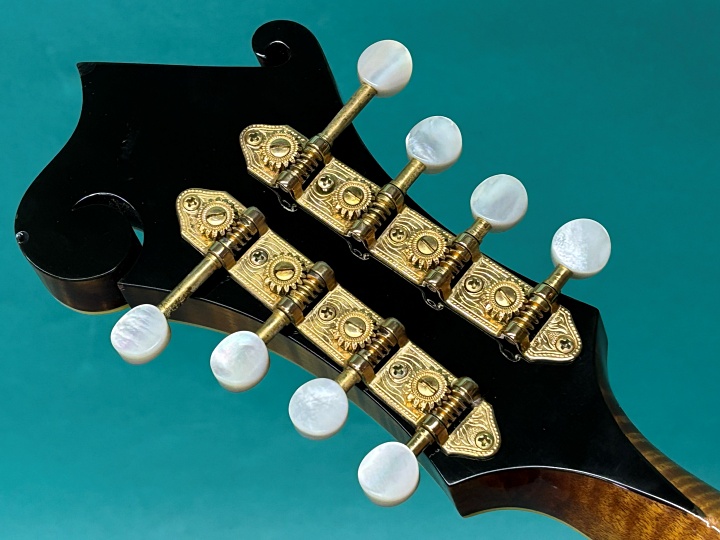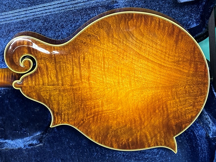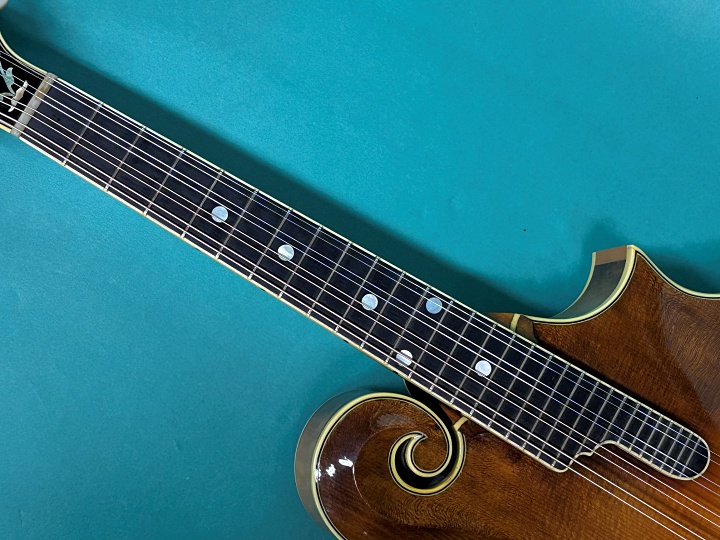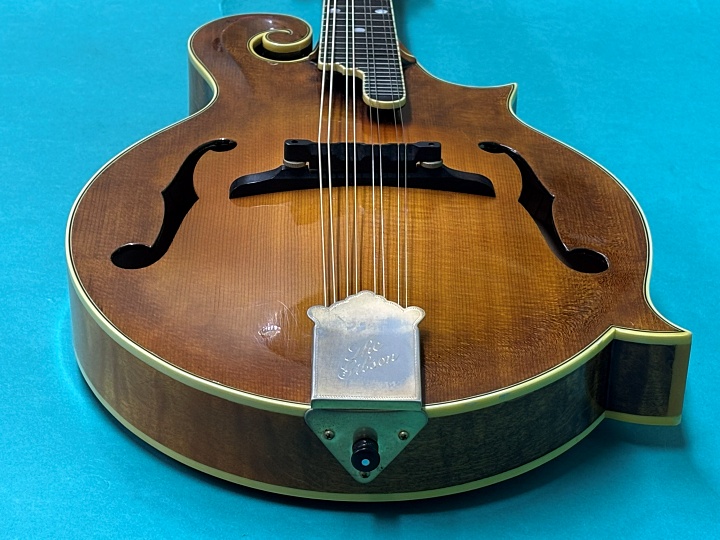 アンバーハニーサンバーストのカスタムモデルF-5です。ロアースペックでスティーブカールソンの手による立ち上がりの良い鳴りの楽器です。