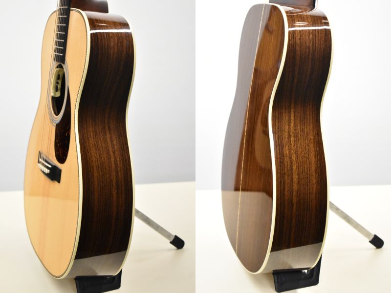 個体の鳴りは、プレミアムグレードトップらしいStyle45の倍音のような優しい響きに、OMサイズの芯のある伸びやかな響きが加わり、Style28では無い上位モデルの音色を奏でてくれます。