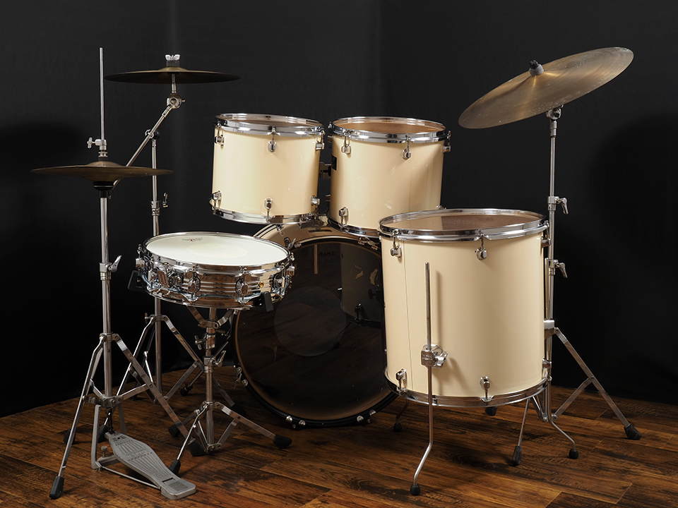 シェルはマホガニーシェルの内側にシナ材をラミネートしたオリジナルプライ。低音成分が豊かで太くタイトなサウンドに仕上がっているので扱いやすいドラムセットです。