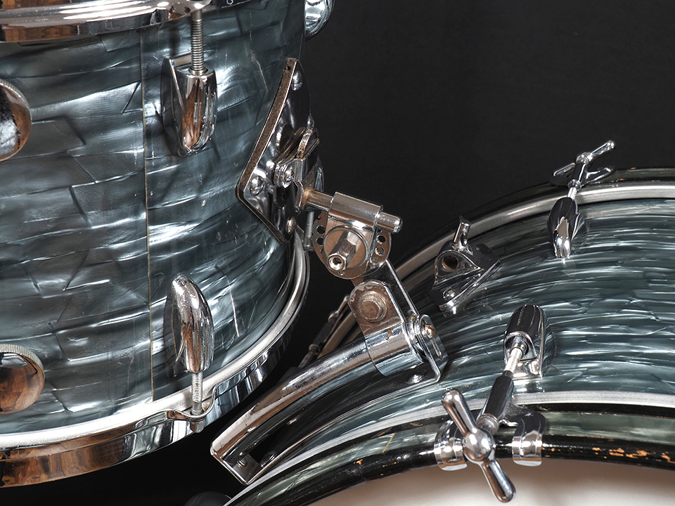 Midnight Blue Pearlのカバーリングにも割れもなく、レイルマウントのタムホルダー、バスドラム上のシンバルホルダーも健在で大変コンディションの良い一台です