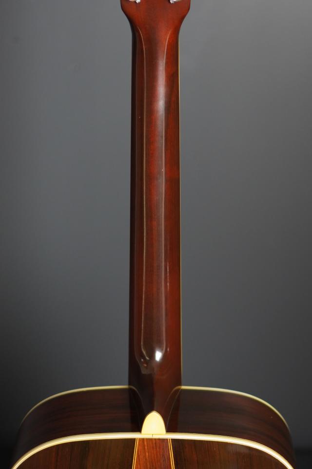 とても綺麗な顔付きですが、ベッコウ柄のピックガードは70年代後半頃から見受けられる色味の薄いタイプですので、レトロで渋い風味を醸し出し、マニアックな箇所ですが、指板エンドのバインディングが1枚巻きでなく、D-45と同じ三枚の巻き方になっており、ボディ内のブリッジ裏のブリッジプレートも、メイプルの小さなサイズを採用したりと、なかなか拘った仕様です。