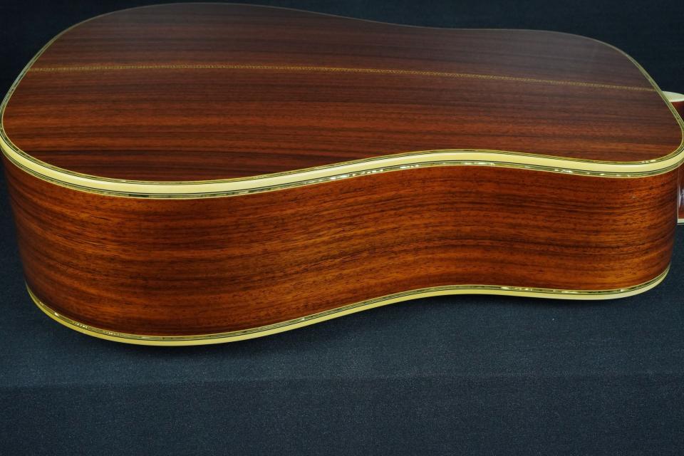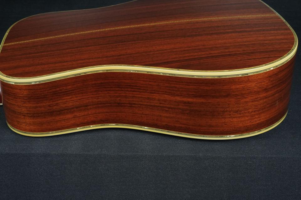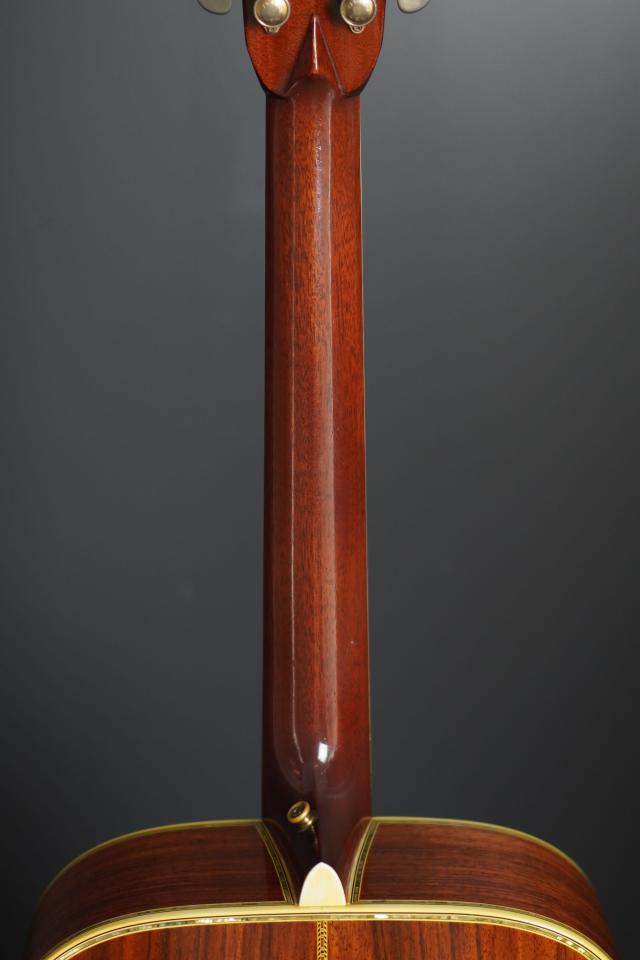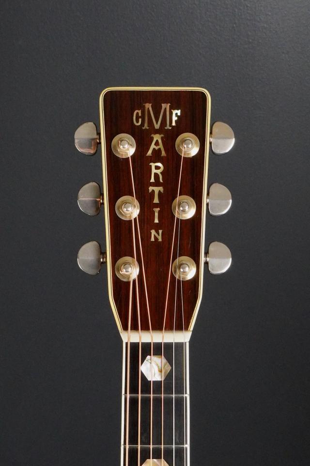 色味の濃いローズウッドのヘッドプレートに「C.F.MARTIN」のアバロンインレイ、1968〜69年のD-45を思わせるような手造り感が強く、パテント刻印の入ったグローバーゴールドのペグやヘッドの形状と合わせて、とても存在感があります。