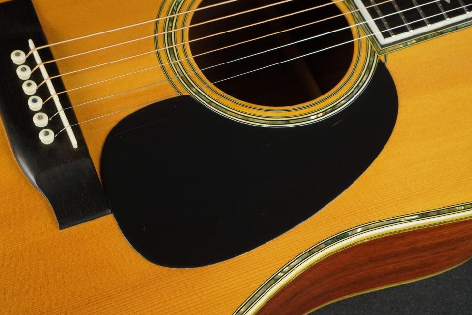 ピックガードはオリジナル同様にブラックで交換され、エボニーのベリーブリッジも交換されており、トップエンド近くの豆粒ほどの打コン修復などもあるためか、トップは薄くオーバーコートされていますが、とても自然な質感です。