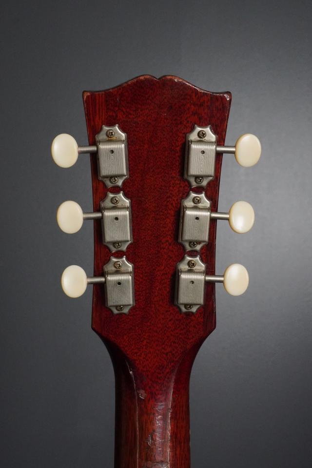 50年代後期の優美なヘッド形状、黒いヘッドトップは経年で細かくウェザーチェックが入り、ギブソンロゴとクラウンインレイも表面のラッカーが黄色く焼け、渋く輝きます。