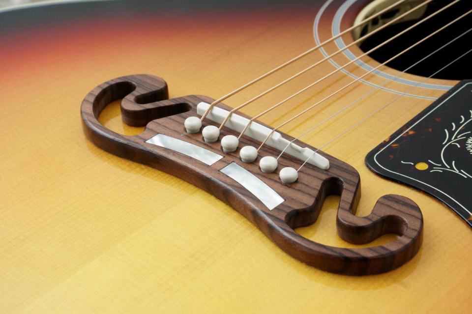 大柄のマスタッシュブリッジにクラウンインレイ、ペグには太めのシャフトが印象的なゴールドインペリアルペグが