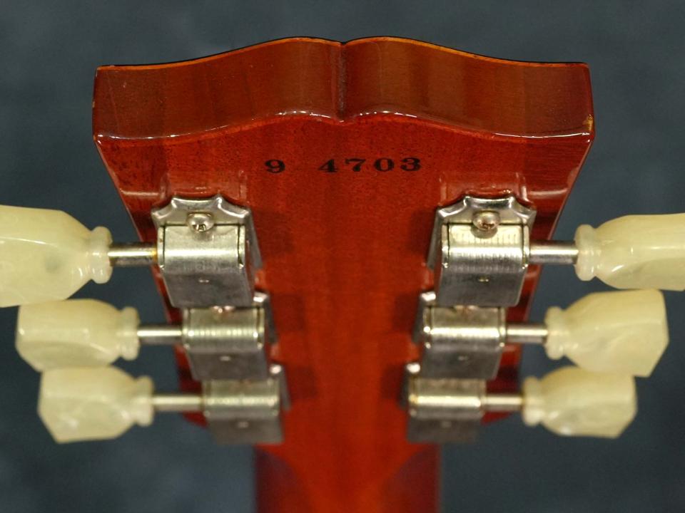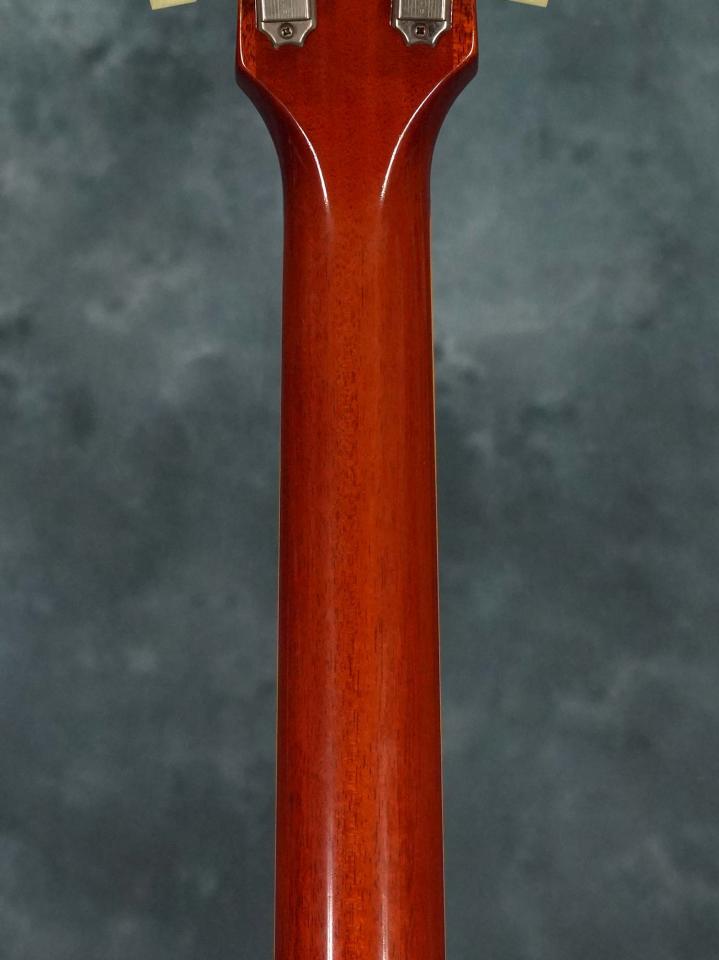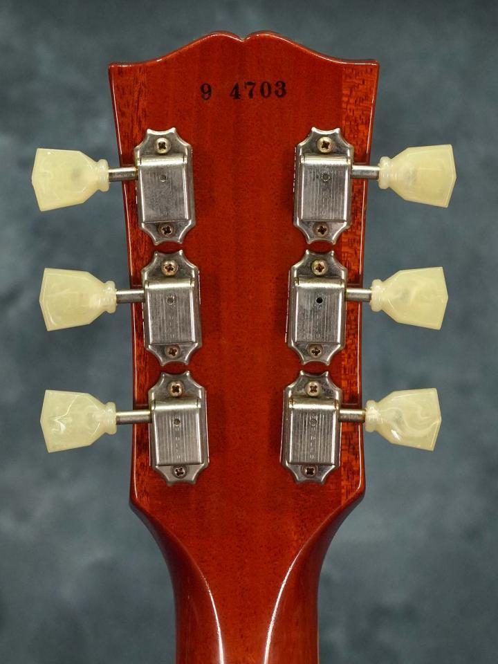 ボディは本来アイスティーバーストでしたが、Washed Cherryとも異なった明るめのチェリーサンバーストにリフィニッシュ~ボディバックやネックもリフィニッシュされています。作業はレスポールのレストアやリフィニッシュを数多く行う愛知県の工房にて行われており、非常に薄いラッカーの塗膜や全体が飴色に色焼けしたようなクリアで仕上げられています。