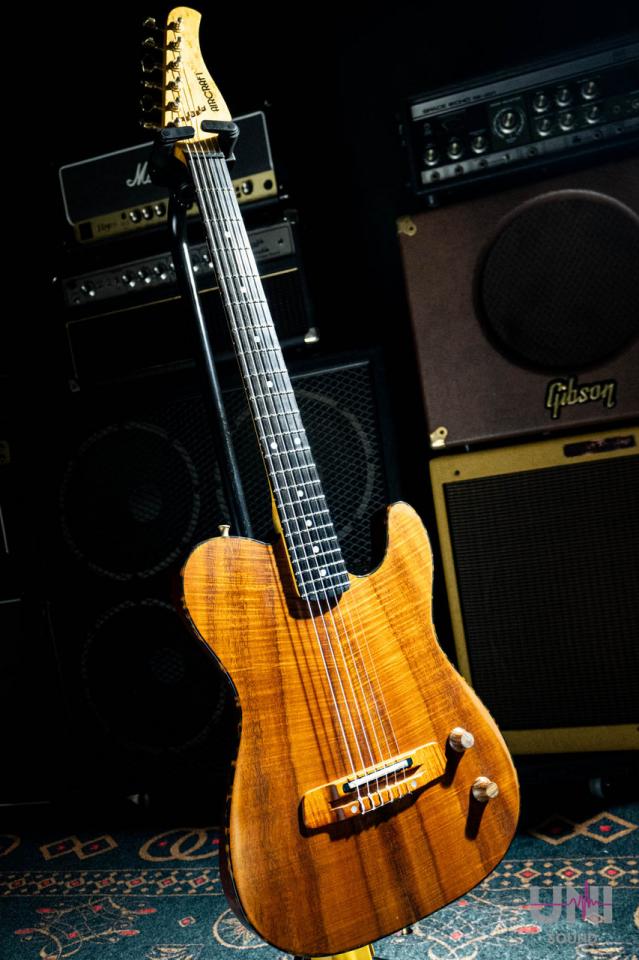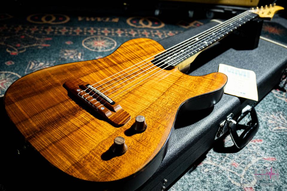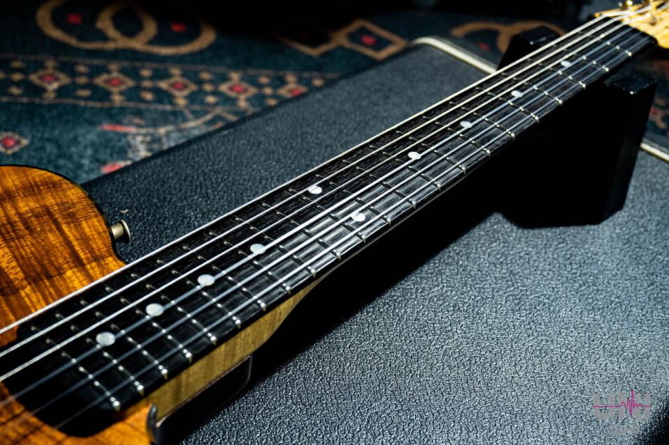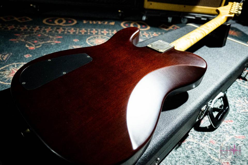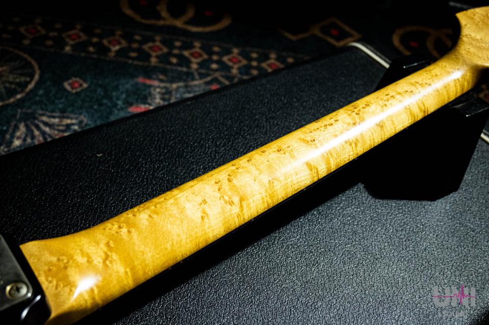 コア材のようなメイプルのようなトップにマホガニーバック、そしてべっ甲柄のバインディングという見た目もロックギター然としたものがありますね。