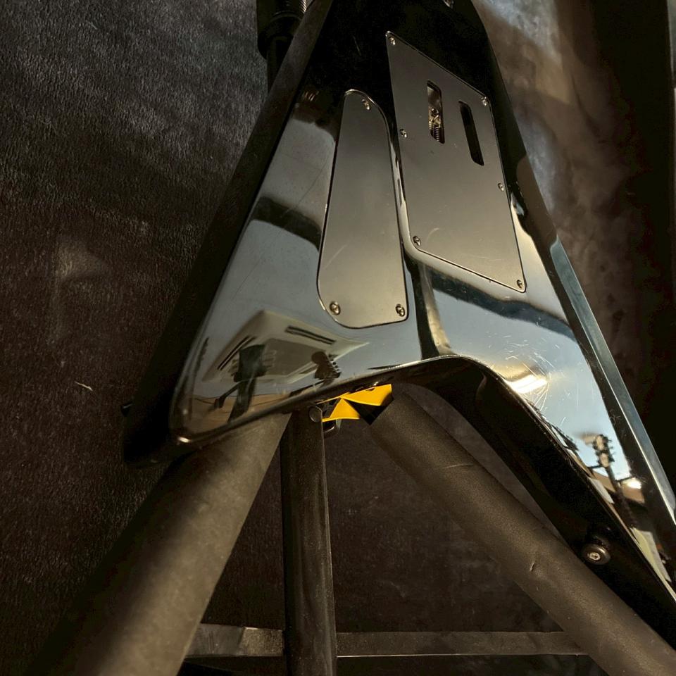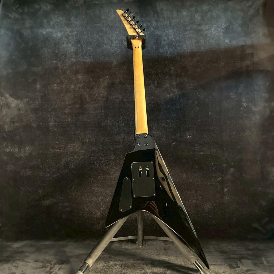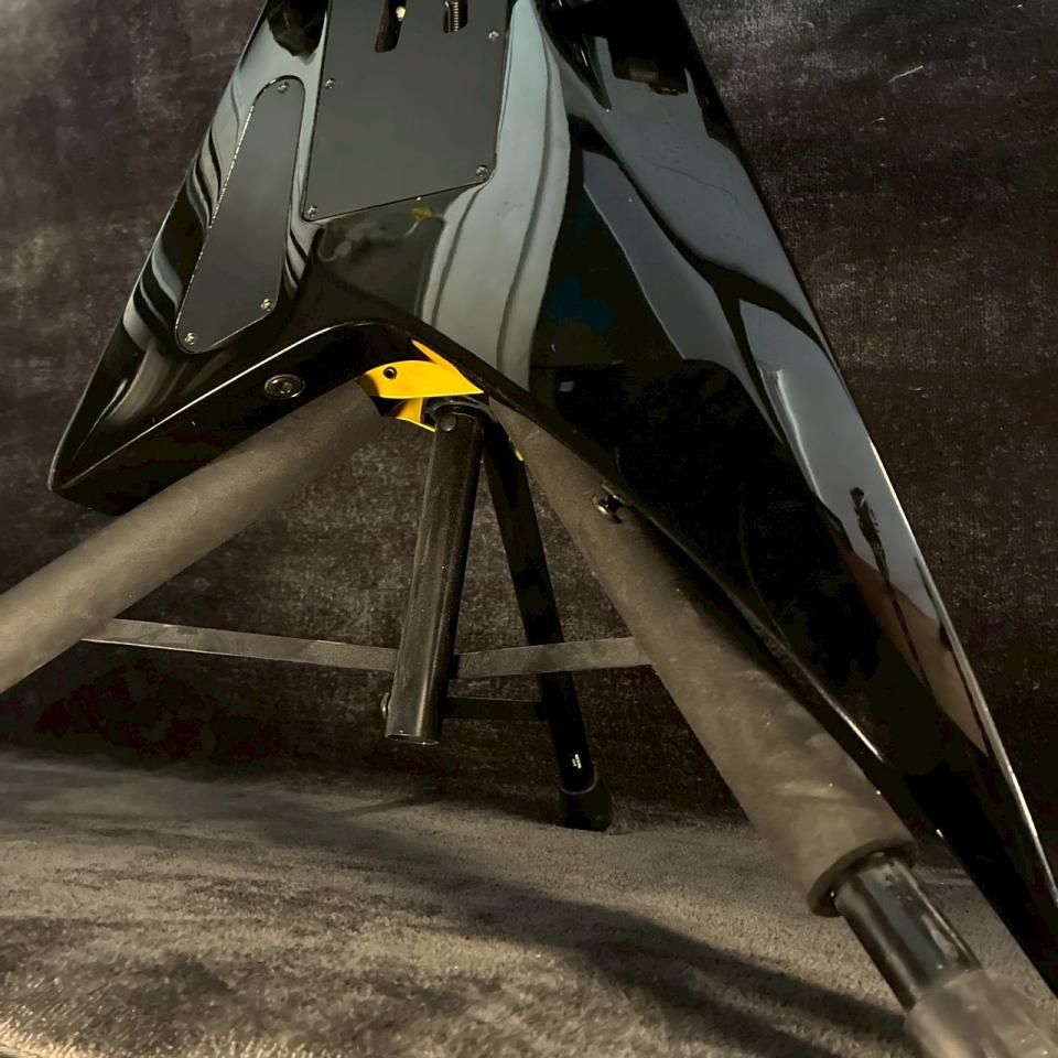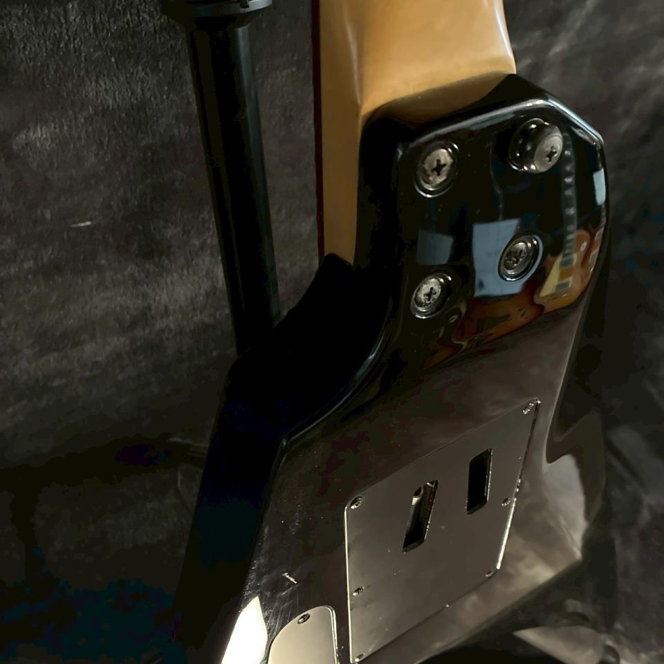 ランディVタイプならではの鋭角的なシェイプは、ステージ上での存在感も抜群。ブラックカラーとの組み合わせにより、余計な装飾を排したシンプルさの中に、強い個性が際立つ仕上がりとなっています。