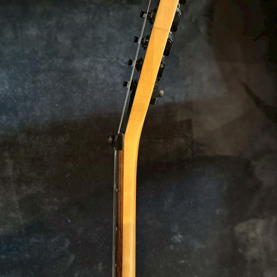 KRAMERは1970年代後半から80年代にかけて、ハードロック〜メタルシーンの中心で支持を集めたブランドとして知られており、当時のプレイヤー志向を色濃く反映した攻撃的なルックスと実用性の高さが特徴です。本機もそうした流れを汲んだ一本で、視覚的インパクトとプレイアビリティのバランスがしっかりと考えられたモデルと言えます。