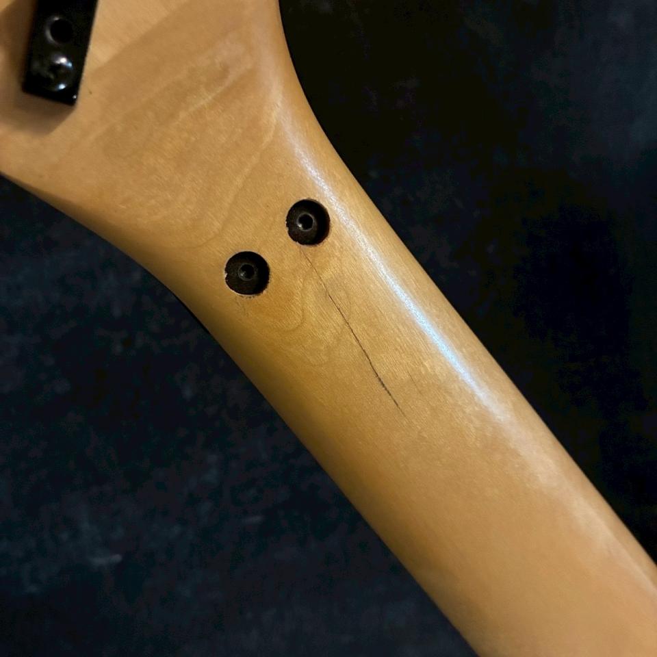 また、ネック裏1フレット付近に亀裂が見られますが、現状動く様子はなく演奏に支障は出ない状態です。