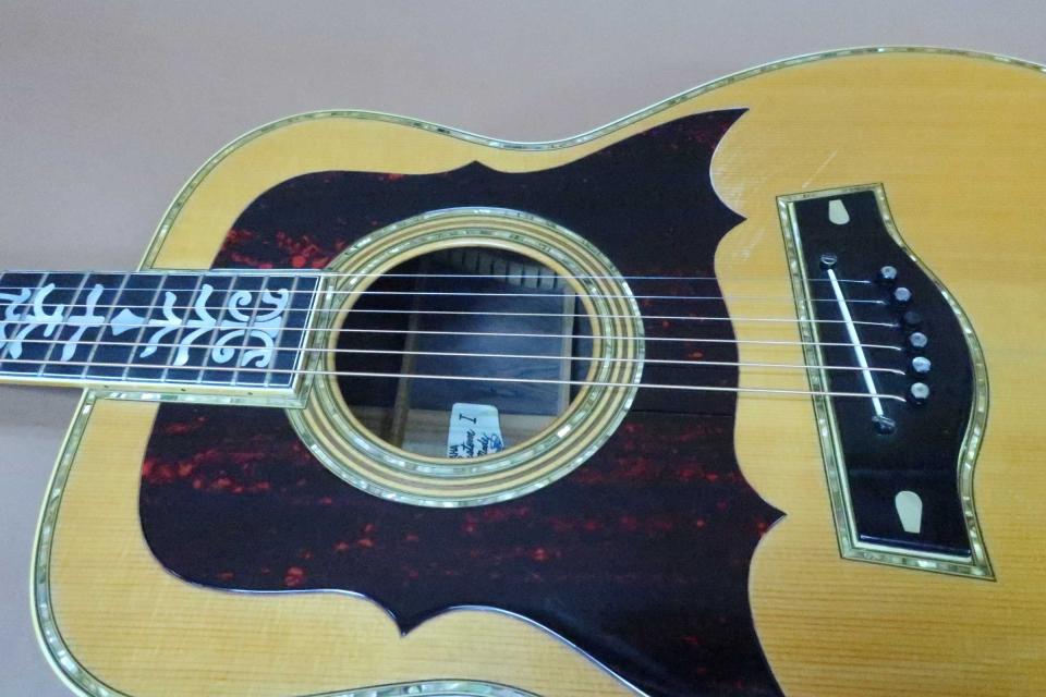 希少なオーダーメイド・モデル、YAMAHA Fork Custom 1 の入荷です!1974年ラグジュアリーLuxury (豪華/高級品)に由来するL-シリーズが誕生しました。本器は試作かプロト・モデルだと推察します。当店でもL-53等のフォークカスタムIIIなどの試作モデルを取り扱いをさせて頂きましたが、YAMAHA L-51 CTMの試作モデルは初入荷です。また驚いたのが他店で瓜二つのモデルが存在していたことです。トップはスプルース単板、サイドは板目杢の高級ハカランダ単板、バックはハカランダ/メイプル/ハカランダの3ピース単板で、 FG-2000やFG-1500で見られる仕様で、ボディは左右非対称のL-51ボディ・デザインが採用されており、ヘッドはL-52,音叉ロゴ、ペグはポスト先端がマイナス(➖)の初期TM-50G、ネックはオリジナル L-51と同じマホガニー材が採用され積層ネックではありません。指板&ブリッジは漆黒のエボニー、白蝶貝の指板インレイ&ブリッジ・インレイとブリッジ周りにもアバロン装飾が施されております。ボディのアバロン・トリムやサウンドホール・ロゼッタにはL-31と同じ極太のアバロン装飾が施されており、ブリッジはL-12でお馴染みのアジャスタブル・ブリッジが採用されております。また良く見ると一枚物のベッコウ柄ピックガードも左右非対称でデザインされおり驚きました。ボディのインナー革ラベルには手書きで『Fork Custom 1Order Made T.Nakamoto』と有り製造年の記載はありません。テリー中本氏がご存命であれば誕生秘話でもお聞き出来たかもしれませんが残念です。