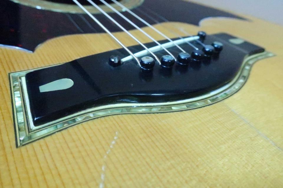 サウンドはノンスキャロップドXブレイシングが採用されていますが、ブレイシングも独自のデザインでブリッジプレートも左右非対称で製作されており、少し低域が強調され、ノーマルのL-51よりアジャスタブルサドルにより中域のグルーブ感があり、高音域はヤマハ独特の煌びやかで透明感のあるクリアな鳴りは健在です。ルックスも含め全てが斬新で流石テリー中本さんと言うしかありません。状態は、ゴールドの初期TM-50Gペグも輝きが残っており機能的にも問題がありません。トップはピックガード下にスクラッチ傷とブリッジ下のセンターシームの塗装の引を修正していますが表面的で内部の補強などはありません。サイドは軽微な擦り傷ぐらいで綺麗な状態を保っており、バックもエンド付近に小さな打痕と擦り傷ぐらいで目立つダメージは見受けられません。ネック裏は3~5F裏にカポ跡が見られネックヒールエンドのサイド側に打コンがの様なストラップピンの穴埋めが見られますがタッチアップされフレットは交換されており殆ど減りは見受けられません。またピックアップの取り付けはありません。弦長651mm、ナット幅実測約44.5mm、弦高は12F6弦で約2.6mm、1弦約2mm、サドルはアジャスタブル・サドルで両端のマイナスネジで上下の調整が可能です。またネック調整用のトラスロッドにも余裕が見られ、元起や反りも問題が無くネックを含めプレイヤビリティは良好です。また最初期のオリジナル・カスタム・ハードケースも付属しております。本ギターはお客様からのお預かり商品で現状販売になります。大切にコレクションされていた希少モデルです。他店のコメントでも有りましたが、ヤマハ四天王を凌駕する唯一無二のレアモデルです。是非この機会にご検討を頂ければ幸いです。