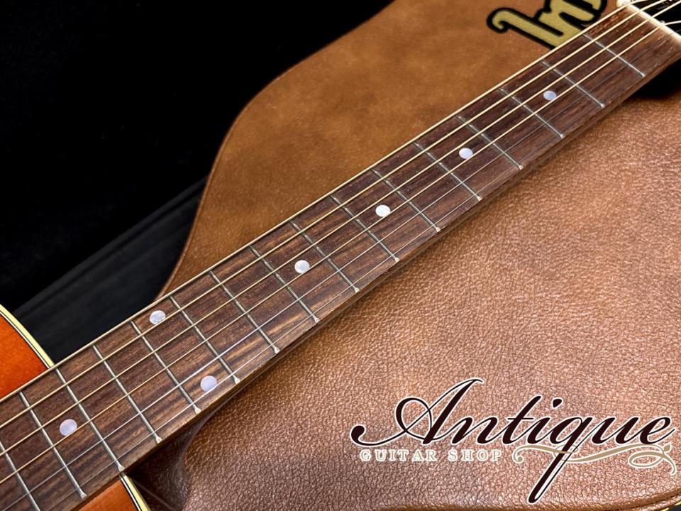 まずそのスペックとしては、マーゴ本人が所有する1960年中期のJ-45モデルがベースとなっており、ラウンドショルダーのジャンボサイズ、トップには美しい杢目のレッドスプルース(アディロンダックスプルース)、サイド&バックにはキメ細やかな杢目を柾目取りにて使用したマホガニー、ボディバックには薄っすらとフィギュアドライクなギラつきも見られます。フィニッシュカラーはヴィンテージを意識したヘリテージチェリーサンバーストのグロス・ニトロセルロースラッカーにて、新品ながらに抜群の雰囲気を以ております。続いてネックにも同様に良質なマホガニーが採用され、指板にはダークなコントラストかつ黒の杢目が走るローズウッドが採用されております。そして何と言っても本モデルの一番の特徴ともなるピックガードですが、両サイドに装着される50年代スタイルの鼈甲ダブルガード仕様に加え、マーゴ自身が『私にとって常に象徴的な存在』と表現する、Red Tail Hawk(アカオノスリ)のモチーフが入っております。その他としては、トラディショナル・アッパーベリーのローズウッドブリッジ、クリームボタンの3連×2グローバー製チューナー、牛骨のナット&サドル、マザーオブパールのドットマーカー、細部スペックとしては、24 3/4“ミディアムスケール、1.725”ナット幅、12”指板ラディアス、14Fジョイントの20F仕様、ラウンデッドプロファイル・ネックシェイプ、トラディショナル・ハンドスキャロップド・アドバンスドXブレーシング、コンパウンド・ダブテイルジョイント&ハイドグルー接着、またエンドジャック&サウンドホールマウントコントロールのL.R. Baggs Element VTCを搭載しております。