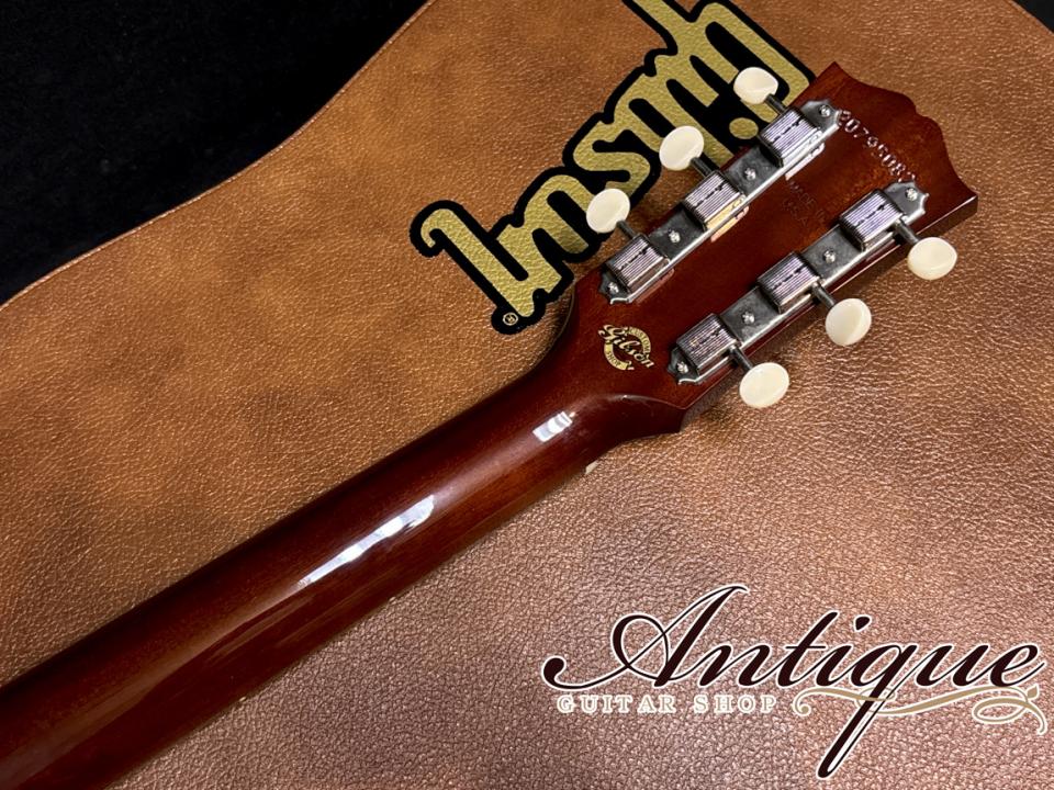 “ワークホース(頼れる馬車馬)”とも評され、Gibsonアコースティックの代表的モデルかつ高い人気を誇るJ-45。今より80年以上前、Jumboシリーズの新しいモデルとして1942年に誕生し、16インチのマホガニーボディ、ラウンドショルダーのスタイルにて、バディ・ホリー、ボブ・ディラン、ドノヴァン・フィリップス・レイチ、ジョン・レノンなど数々のレジェンド達の愛用、国内では吉田拓郎を筆頭に奥田民生、斉藤和義、長渕剛、そして近年では、あいみょんや星野源といったヒットチャートを賑わすシンガーソングライターもJ-45を愛用されております。多くのサウンドシーンを生んだ名機J-45ですが、その大きな特徴となるラウンドショルダースタイルは1929年にまで遡り、当時世界的に流行していたハワイアン・ミュージック全盛期に発表された“ハワイアン・ギブソン”と呼ばれるフラットトップ・ギター“HG-24”モデルに始まり、1934年にJumboモデル、1937年にSuper Jumbo(SJ-200)モデル、そして1942年のJ-45/50モデルに引き継がれ、今ではGibsonを代表するオリジナルシェイプとなっております。