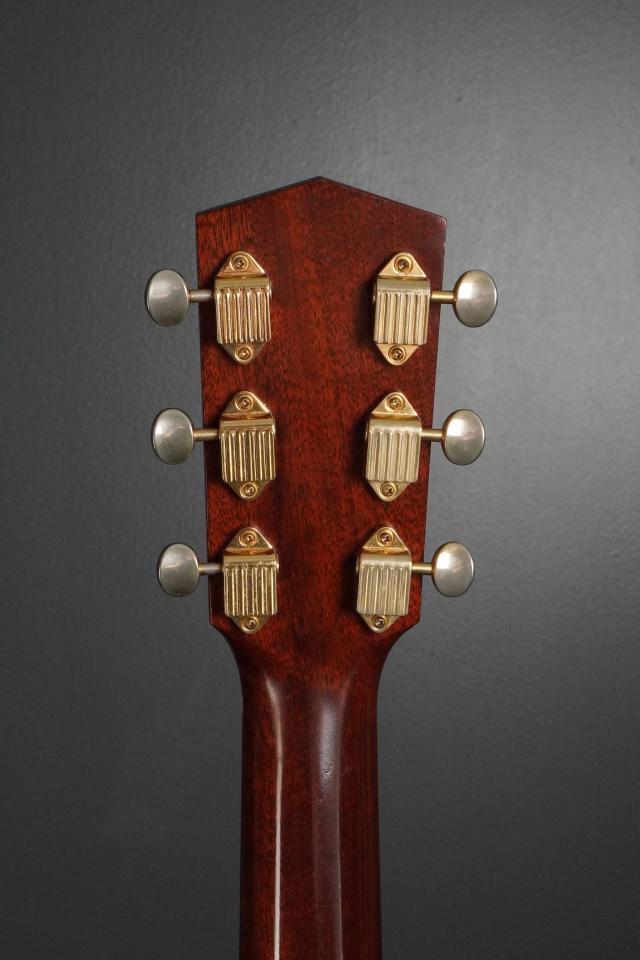 ヘッドシェイプはオリジナルデザインで、とてもシンプルな形状ですが、上方のエッジを斜めに落とした造形や、オリジナルのFのロゴマークなど、とても品良くエレガントにまとまっており、この時期としては珍しく、ルシアーメイドのようなスマートさを感じさせるデザインで、ペグがワッフルバックのゴールドというのもマニアックな仕様です。
