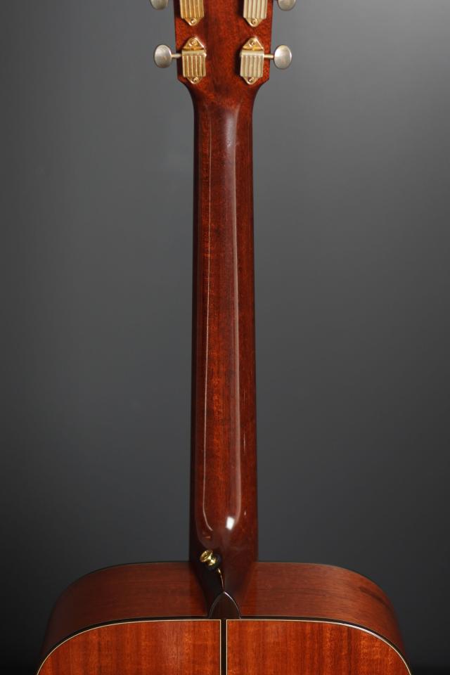 黒々としたエボニー指板には、小振りなスプリットダイヤモンドのポジションマークが、3、5、7、9、12、15、17フレットに、それぞれシングルで入っており、ナット幅42.8mmのマホガニーネックは、握るとラウンドっぽいグリップですが、僅かにピークを感じる程度のややVシェイプになっていて、フィンガースタイルでも、握り込んでのストロークでも弾き易い、守備範囲の広いグリップ感です。