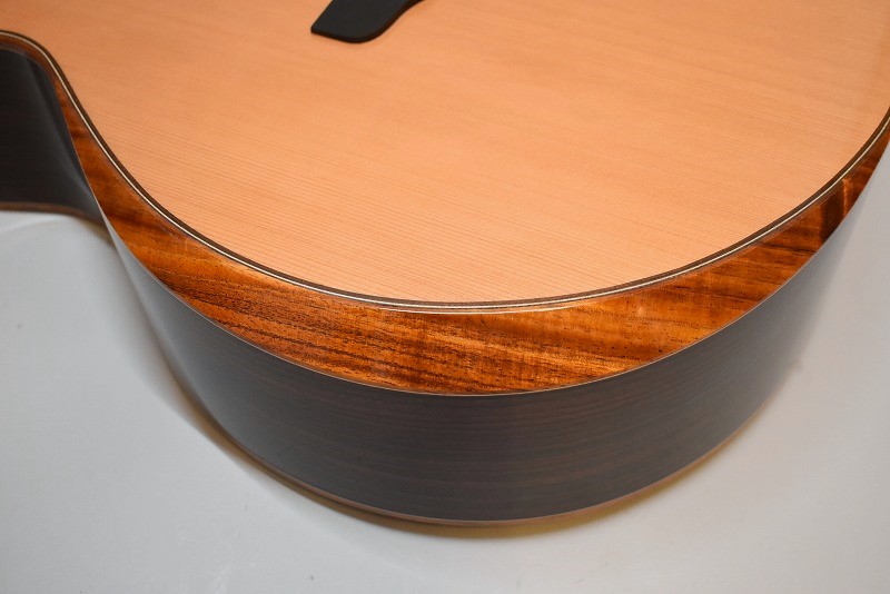 カッタウェイとエルボー部分にハワイアンコア材によるコンター加工を、さらにネックヒールサイドにカット加工を施すことでプレイアビリティを高めています。また、コンター加工に合わせてGrand Soloよりも胴厚をわずかに厚く設計することで、ピッキングレスポンスを損なうことなく、さらに深みのある豊かな音量を実現しています。