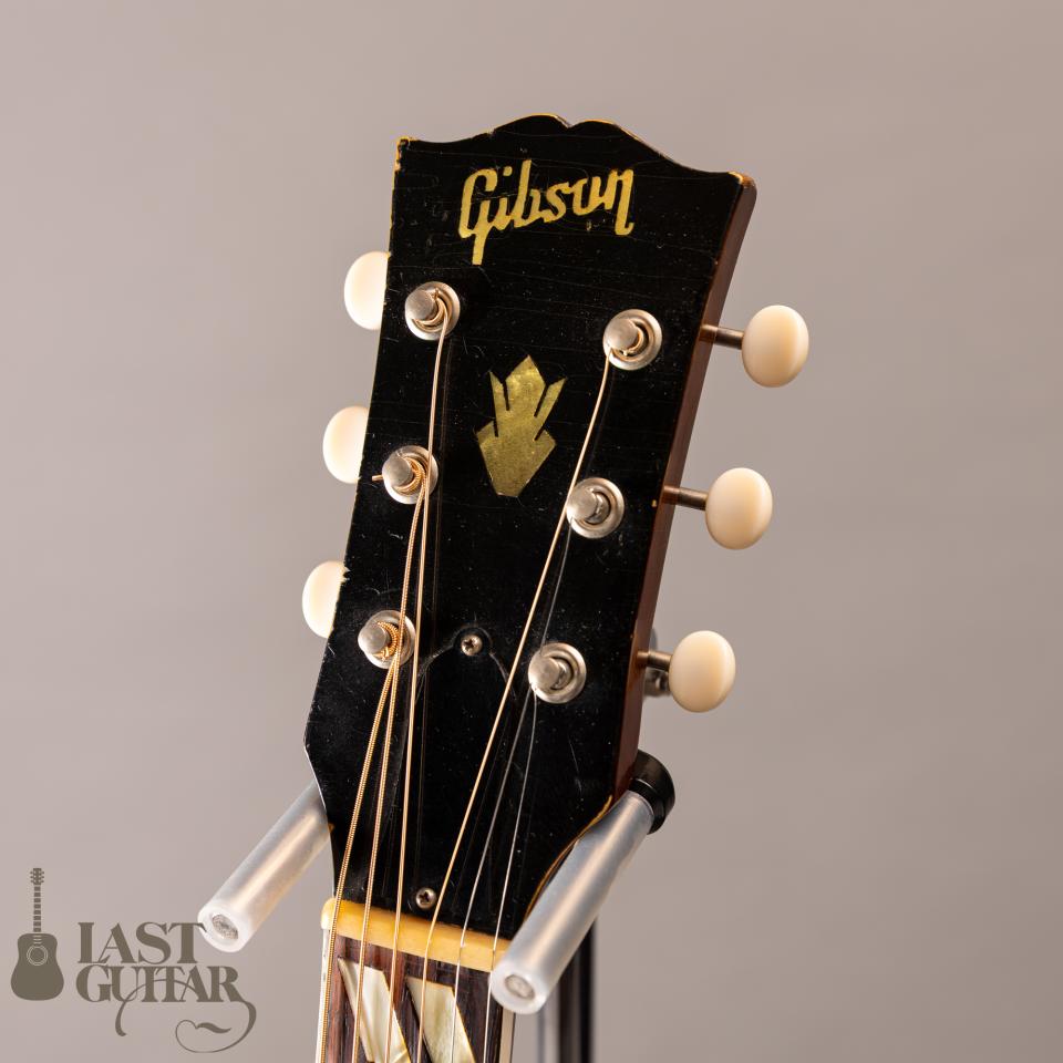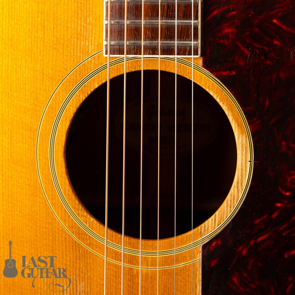 カントリーウェスタンは、もともとはサザン・ジャンボのナチュラルカラー・バージョンにあたり、1955年に初めてCountry Western Jumbo というモデル名で登場しました。インサイドラベルは、中央にモデル名を配置し、投げ縄をモチーフにした縁取りデザインが採用されています。J-45より多くの装飾的アップグレードも施されており、指板にはスプリット・パラレログラムのインレイ、ヘッドストックは美しくGibsonロゴが輝き、クラウンインレイも入っています。さらに、バインディング付きの指板や、トップとバックには多層のバインディングが施されています。