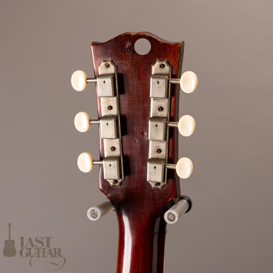 仕様は、1961年にはアジャスタブルブリッジへ、1962年後期にはラウンドショルダーからスクエアショルダーとなり、それに伴いピックガードも3ポインテッド仕様に変更されます。本機は、そのちょうど過渡期にあたる1962年製で、貴重なラウンドショルダー最終期の個体です。バリバリと入ったウェザーチェック、ピックガードまわりに見られる弾き込み具合がすごく良くヴィンテージの良い顔をしています。