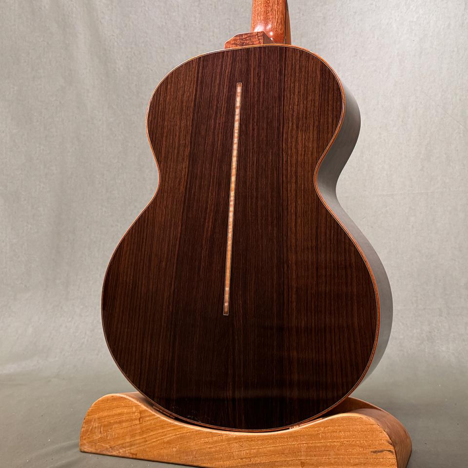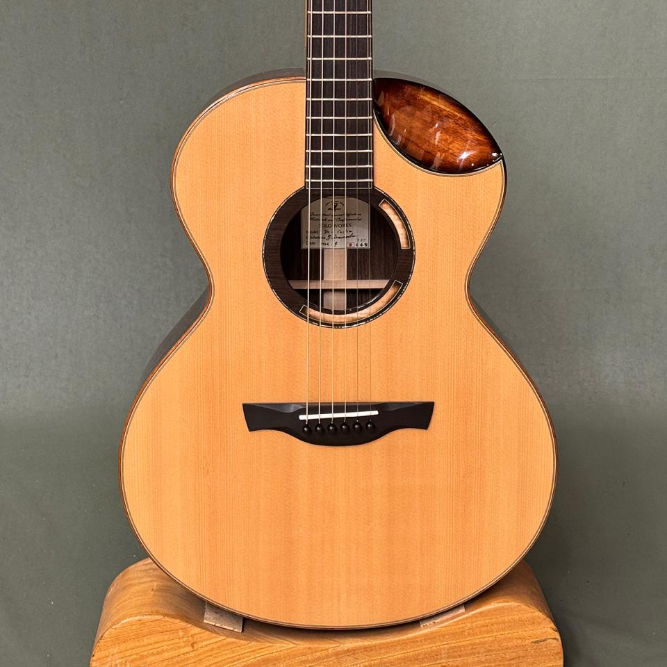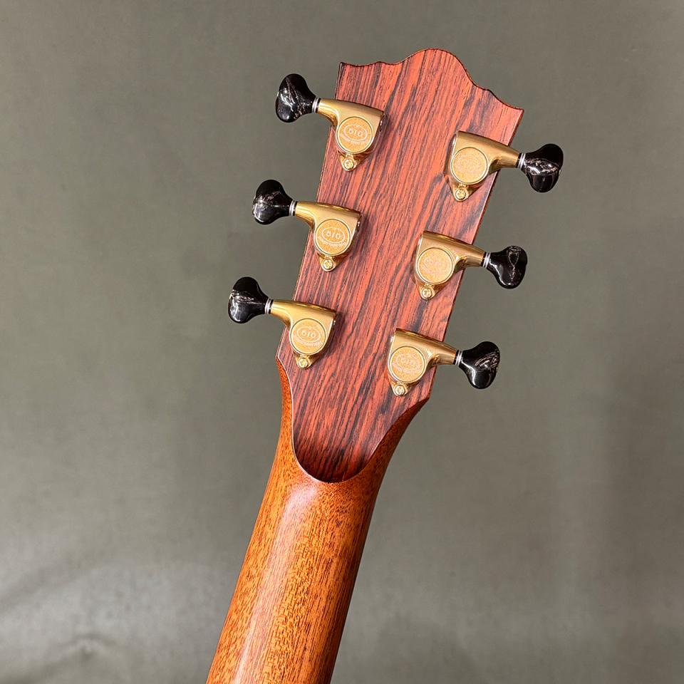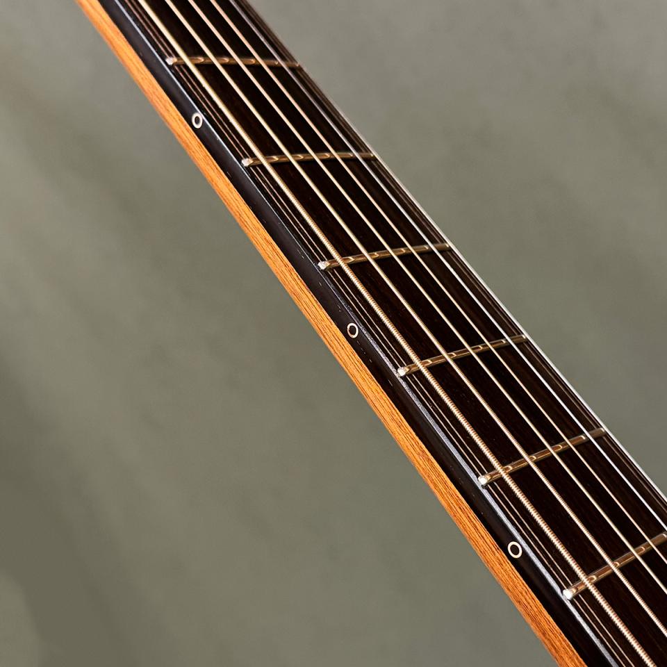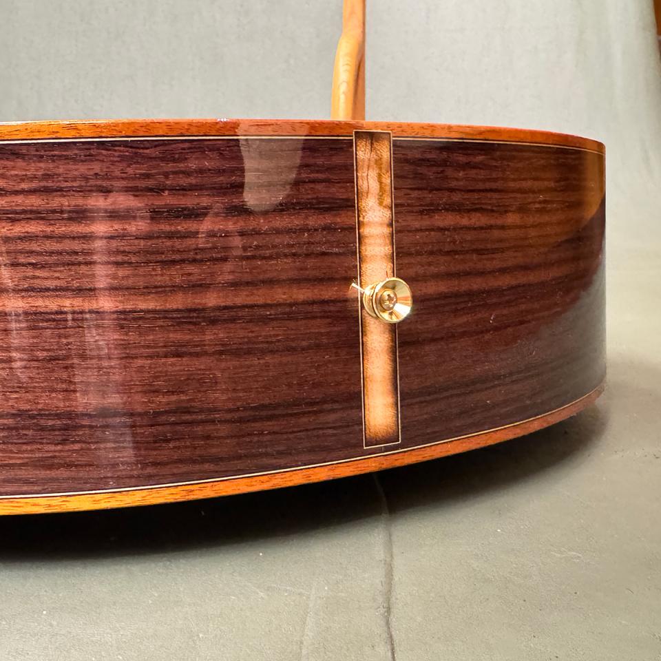 シトカスプルース × インディアンローズウッドの王道ウッドマッチに、スクープド・カッタウェイ、エンドラッカー、そして美しいグラデーション入りサウンドホールトリムを組み合わせた、唯一無二のカスタムモデルです。