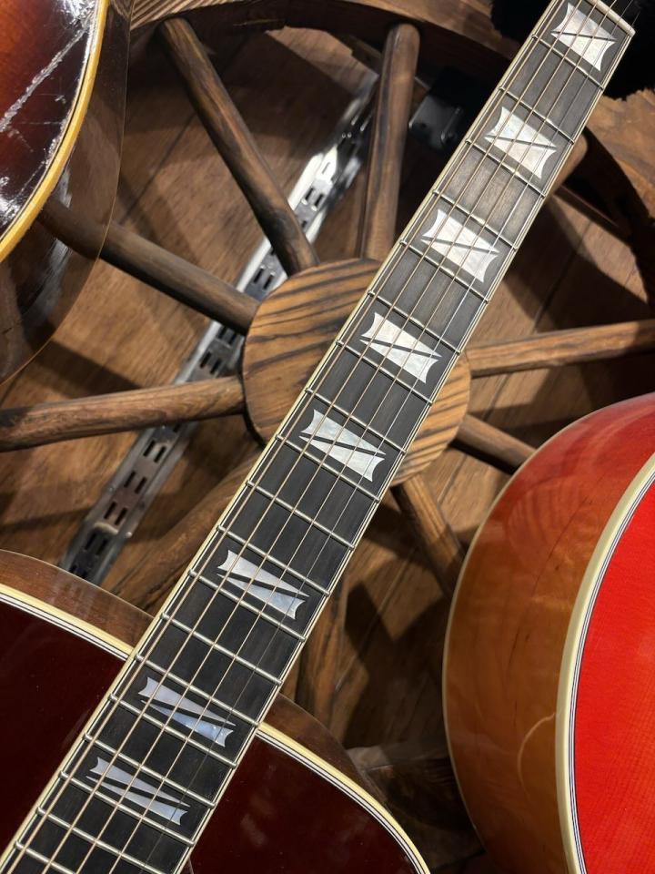ヴィンテージサンバーストカラーにべっ甲ピックガード、べっ甲のロゼッタ、復刻を記念したスクリプトロゴ等、