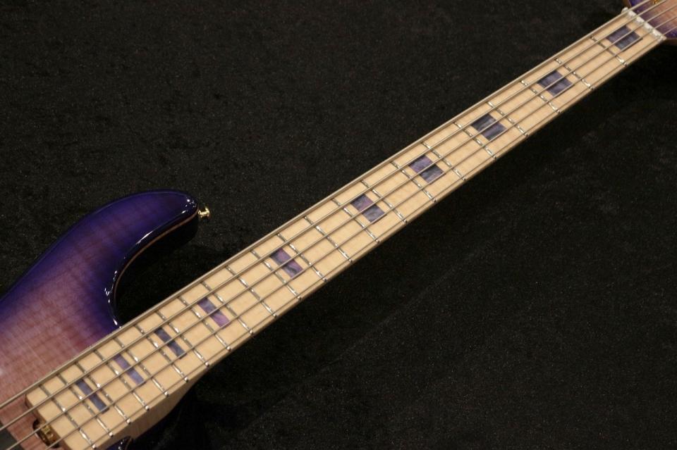 22フレットのオイル&ワックス仕上げのホワイトフレイムメイプルネックとフィンガーボードには、パールパープルのブロックインレイ、マッチングフィギュアドメイプルヘッドストック、そしてゴールドパーツが上品にアクセントを添えています。