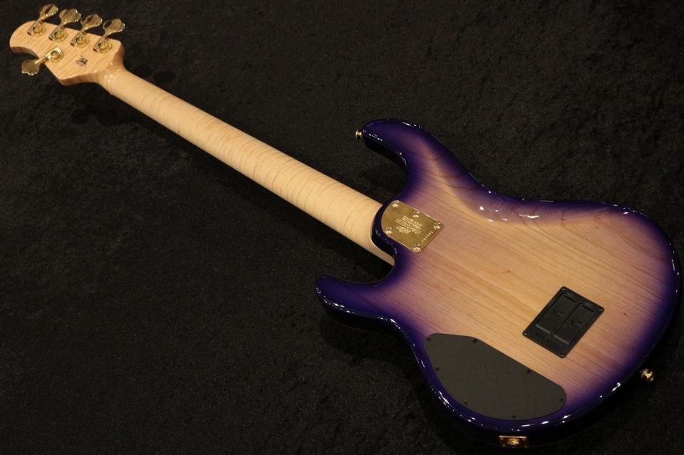 世界限定100台のBall Family Reserve「Moonbeam」StingRay Special 5 HHベースは、ベース本体の表裏両面に美しいパープルバースト仕上げが施され、軽量で上質なアッシュ材にフィギュアドメイプルトップを組み合わせた構造となっています。