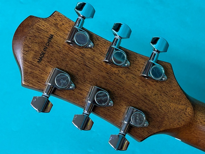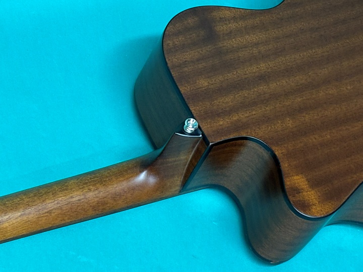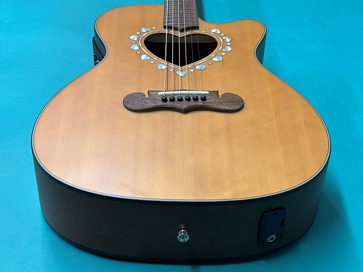 横幅392mm(約15インチ)のカッタウェイボディ。トップは単板スプルース、サイド&バックはラミネート・サペリ、マホガニーネックにローズウッド指板&ブリッジを採用しています。ブリッジはオリジナル同様のマスターシュデザインです。