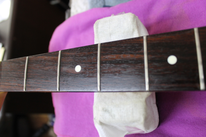 本器の状態としまして、外観は小さな打痕が多くさんありますが、大きく目立つものはございません。プレイアビリティにつきましては、フレットは約70%残、ネックはほぼストレートです。ロッドも左右に余裕がございます