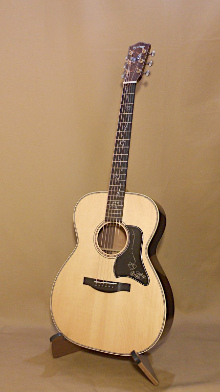 ヘッドウェイギターの販売元であるディバイザー社の30周年を記念して18本のみ製造されたリミテッドモデル。ボディタイプはホールド感のよいフォークタイプの000サイズボディ。パワフルな鳴りを生み出す希少材アディロンダックスプルースをトップに配し、サイド&バックはローズウッド。バックは3ピースでセンターには桜材を使用しています。国蝶のオオムラサキをモチーフにしており、ヘッドには紫のグラデーションが美しいインレイ、指板ポジションにもローからハイフレットへ向けて羽ばたく蝶の細かなインレイが施されています。ピックガードにも掘り込みにて同デザインが入れられております。また、ボディバックセンターも紫色のグラデーションカラーに仕上げられた優美なルックスの一本です。手の小さめの方でも弾きやすいエキストラスリムUシェイプネックや強度と音量バランスに優れたセミフォワードシフトブレイシング等、演奏性や音質面でも職人の拘りが込められたモデルです。USED品ではありますが、ボディトップに薄い打痕が数点見られる他は使用感はそれほどない状態です。。演奏性も良好で張りと艶のあるサウンドを即楽しめますが、弾き込むことでまだまだ今後も磨きをかけていけるでしょう。このモデル専用のサウンドホールカバーも付属します。