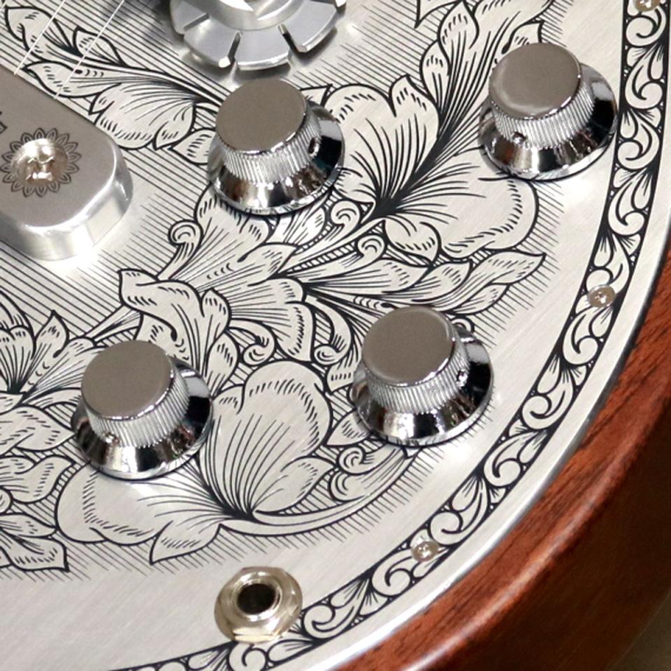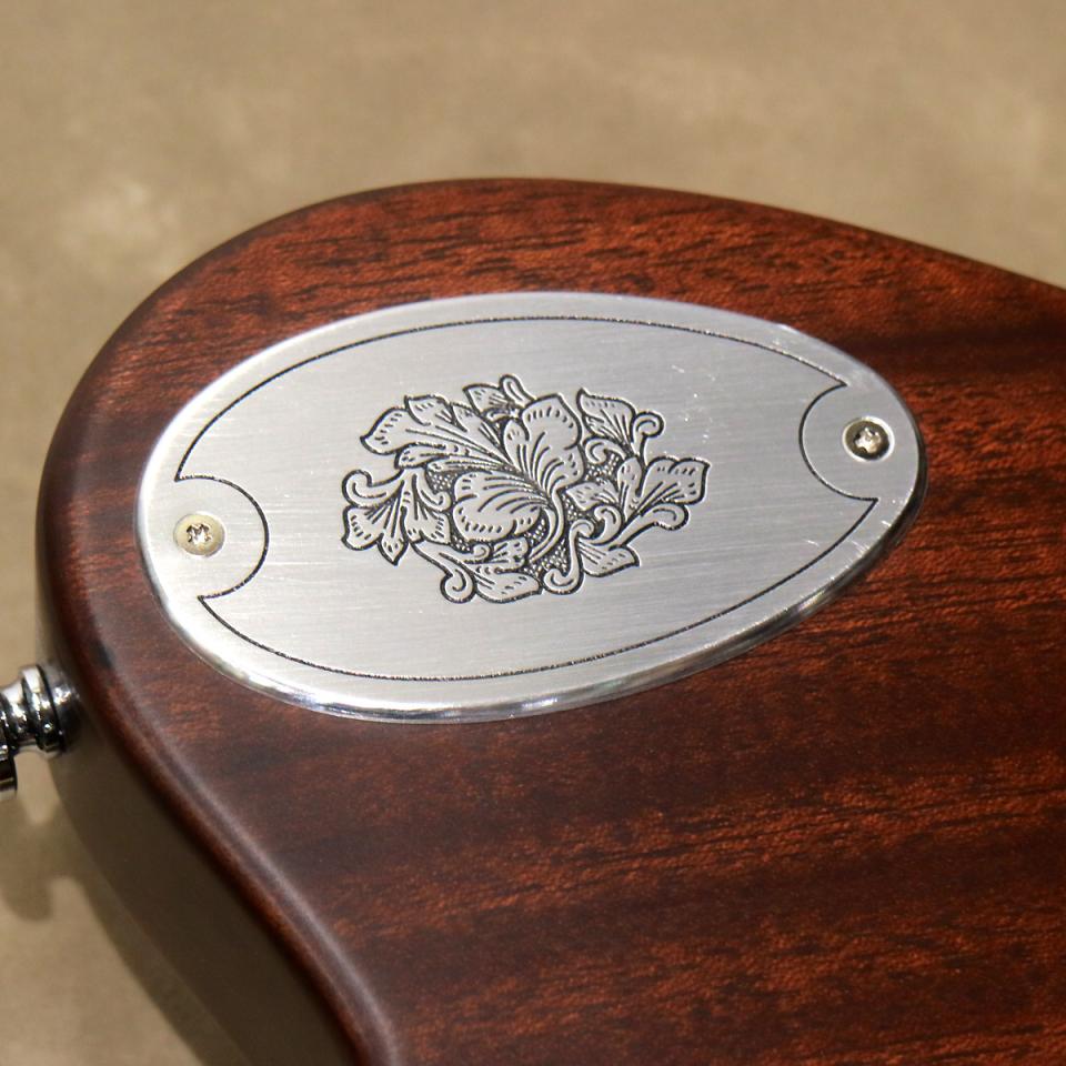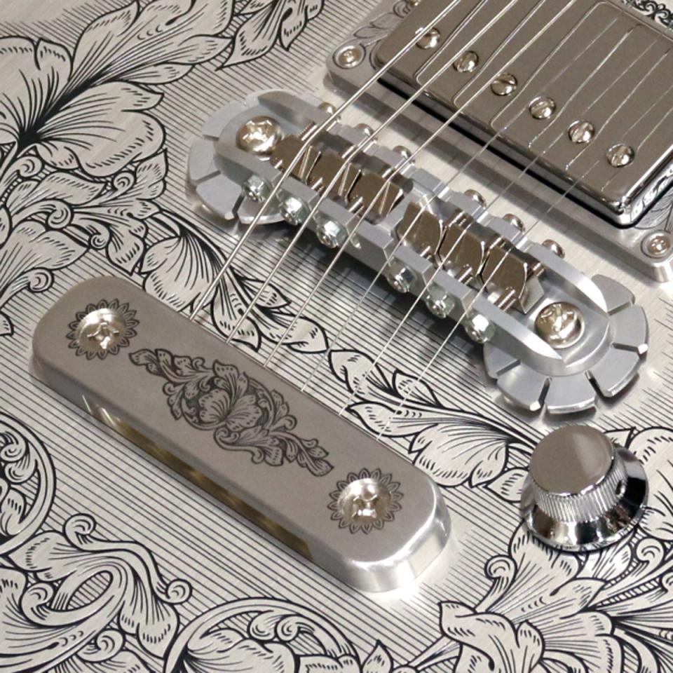 同様にアルミ合金を用いたヘッドのダイアモンド・エンブレム、トラスロッド・カバー、テイルピースやピックアップ・リングをはじめ、アウトプット・ジャック・プレート、コントロール&スイッチ・バック・プレートに至るまで彫金を施しています。