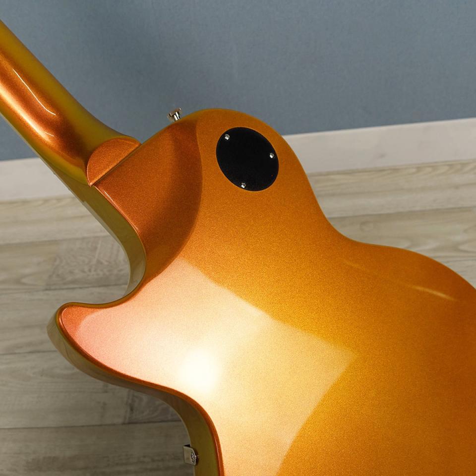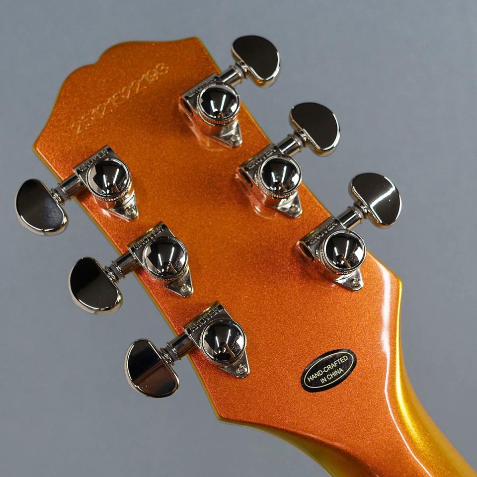 セットネック構造のマホガニー・ネックはロングテノン仕様で、素早い運指を可能にするモダンCプロファイルを採用。バインディングが施されたエボニー指板には、22本のステンレス・スチール・ミディアムジャンボ・フレット、エレガントなSuper 400スタイルのパーロイド・スプリットブロック・インレイ、そしてスムーズなコードワークとチョーキングを実現する10~14インチのコンパウンド・ラジアスが採用されています。バインディング仕様のカラマズー・ヘッドストックには、ロッキングGrover RotomaticチューナーとGraph Techナットを備え、エピフォン・ロゴとマザー・オブ・パールによるカスタム・スプリットダイヤモンド・インレイが施されています。